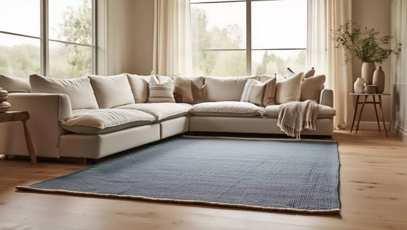 Tapis tissé main en laine et coton, bleu ardoise aux nuances douces. Élégance nordique et texture vivante.