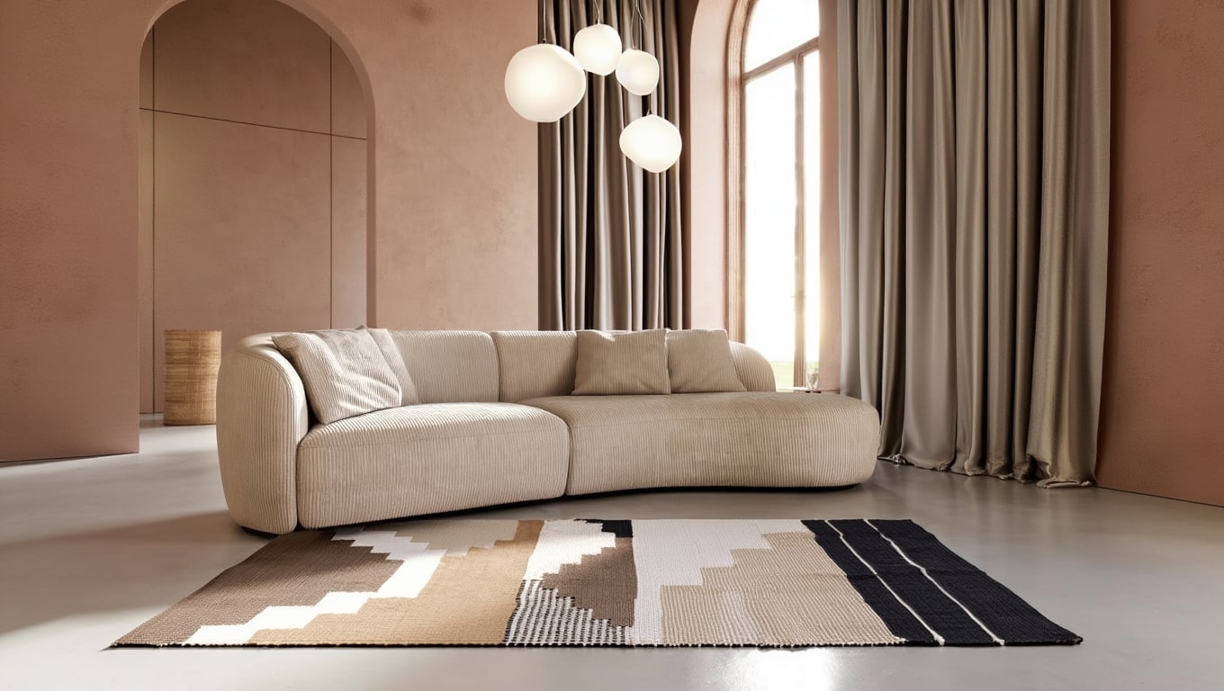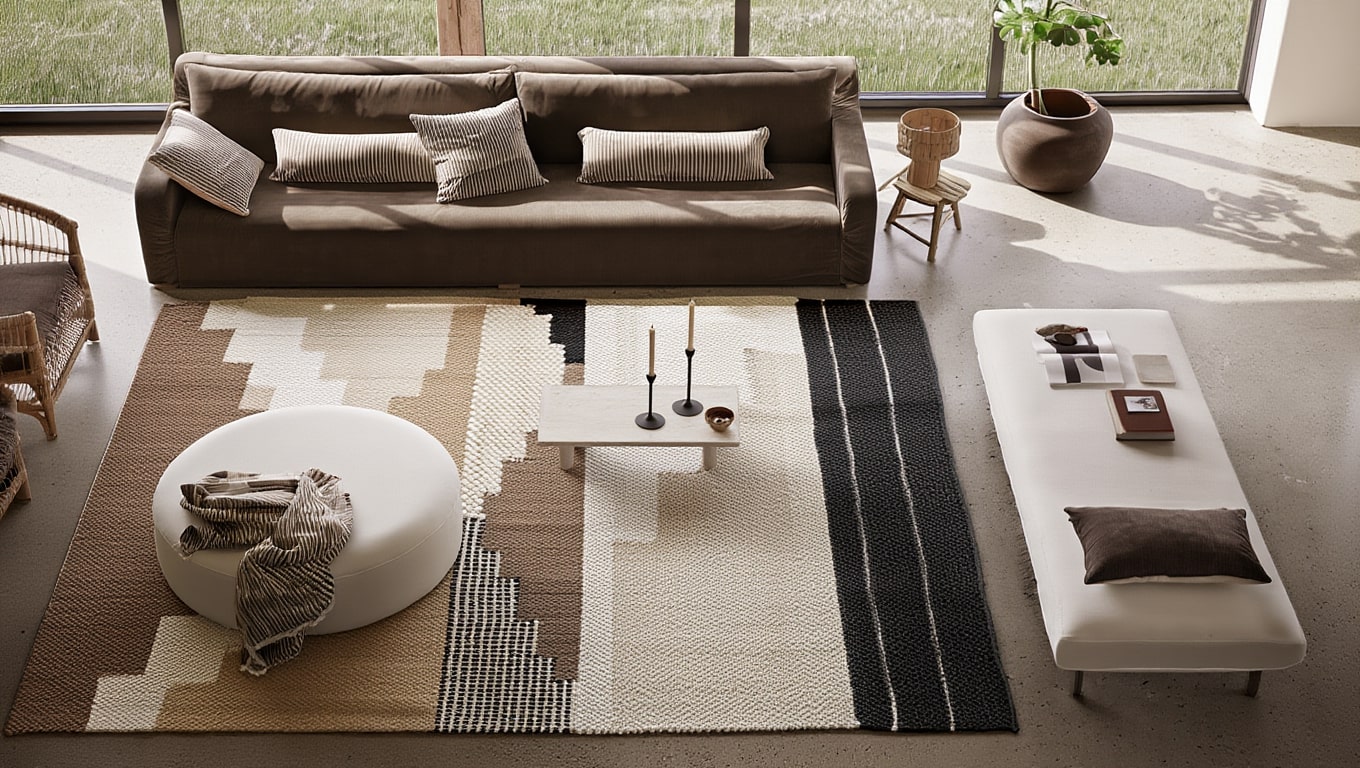 Arlo associe la douceur de la laine à la rigueur d’un motif abstrait. Ses teintes brunes, beiges et noires rythment le sol sans le dominer. Tissé à plat, il crée une présence stable et réchauffe les intérieurs épurés. Sa texture dense et mate absorbe la lumière et apporte une sensation de confort durable. Arlo s’inscrit dans l’esprit Organic Modern par son équilibre entre naturel et géométrie.
