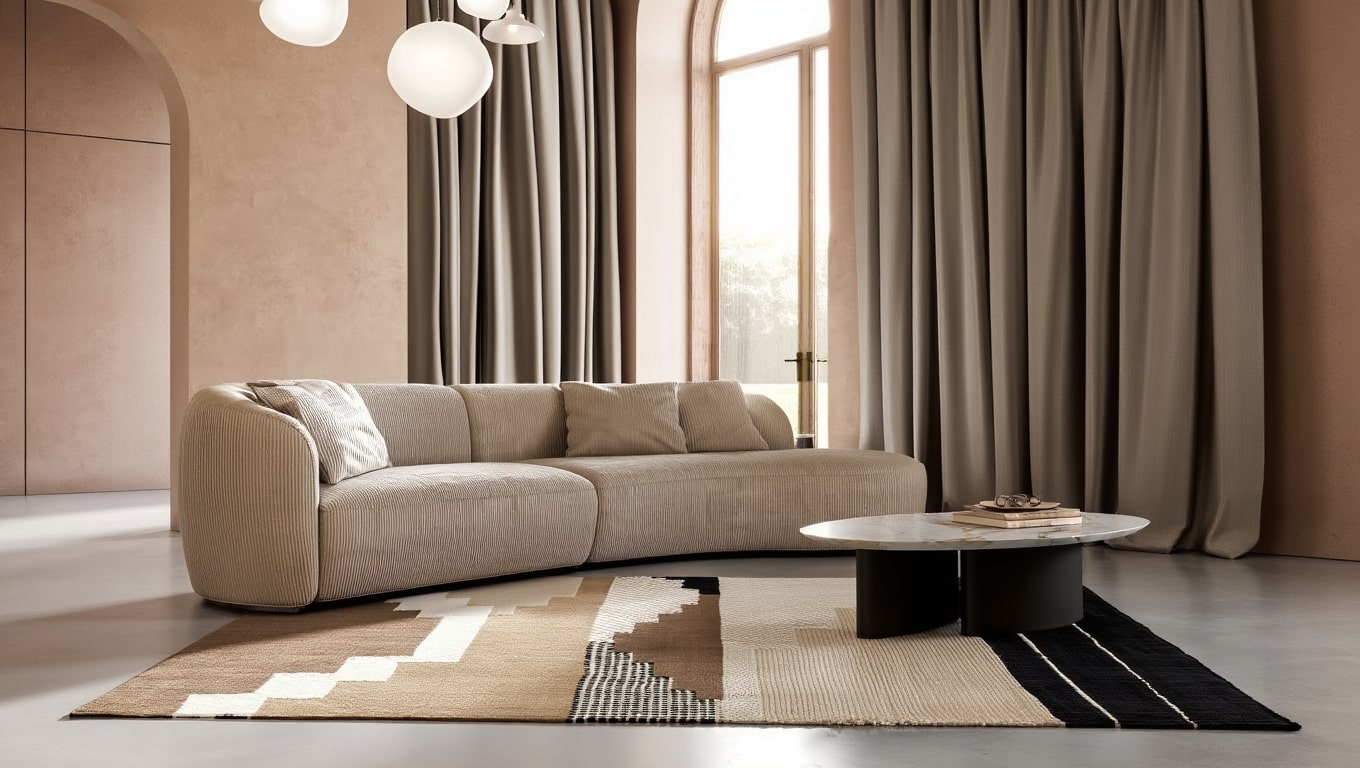Arlo s’impose comme un ancrage visuel élégant. Tissé en laine, il associe la chaleur du brun et du beige à la rigueur du noir. Sa texture mate absorbe la lumière et souligne les lignes de mobilier sans lourdeur. En format 300×200, il habille le centre d’un salon ou la zone repas avec un équilibre entre contraste et douceur. Fidèle à l’esthétique Organic Modern, Arlo relie les matières brutes à une géométrie apaisée.
