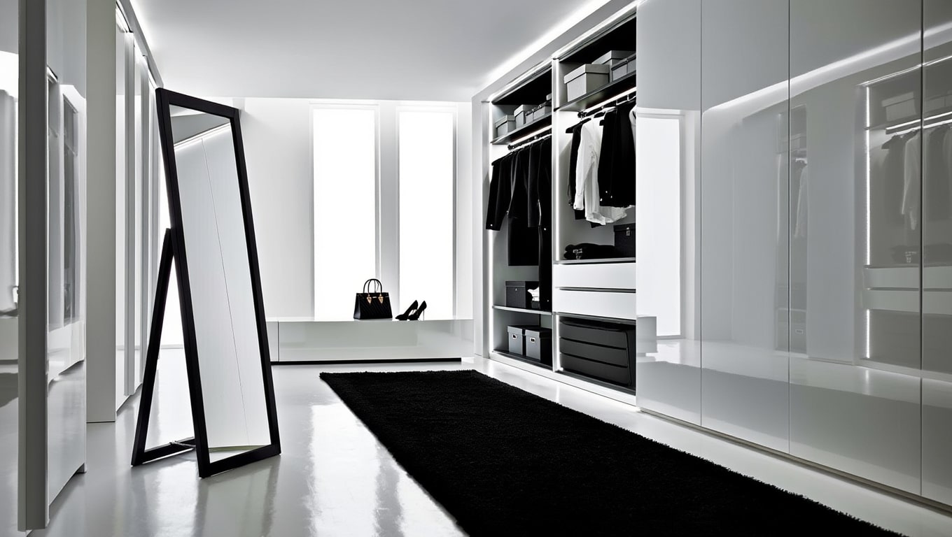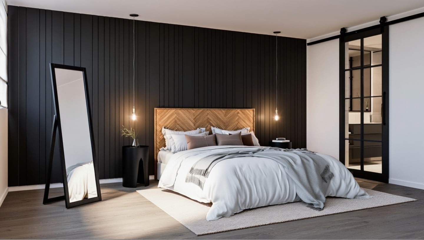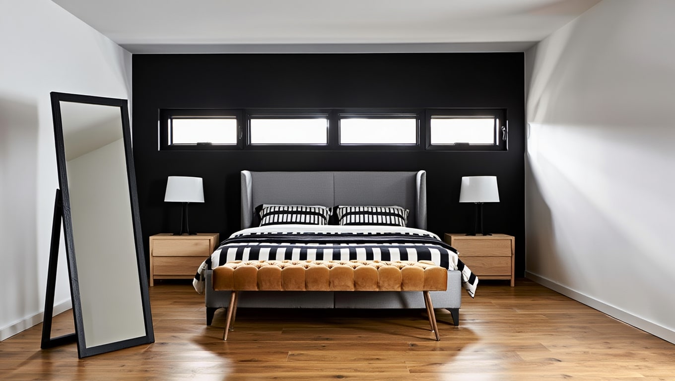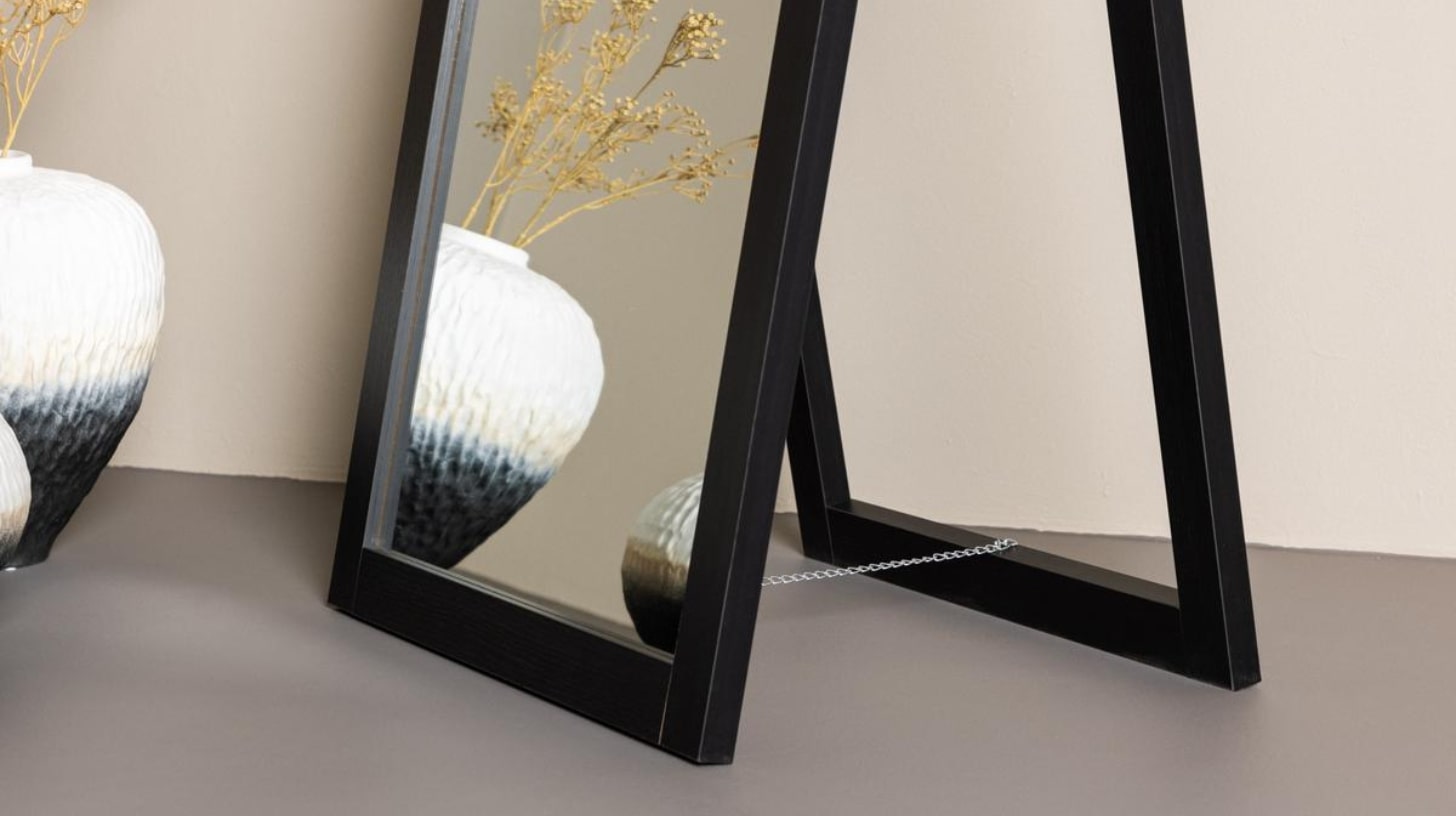 Miroir sur pied noir aux lignes fines qui étire la silhouette, agrandit visuellement la pièce et apporte une touche graphique dans la chambre ou l’entrée.