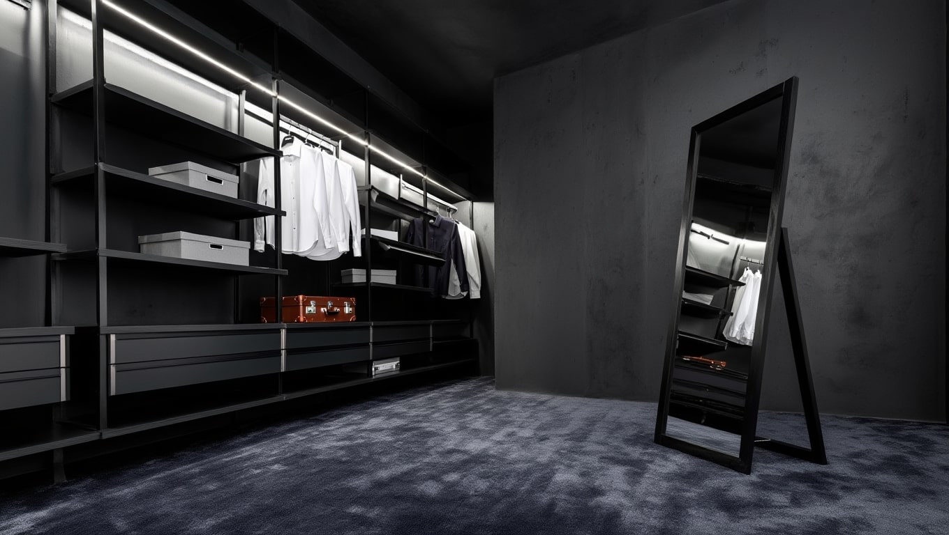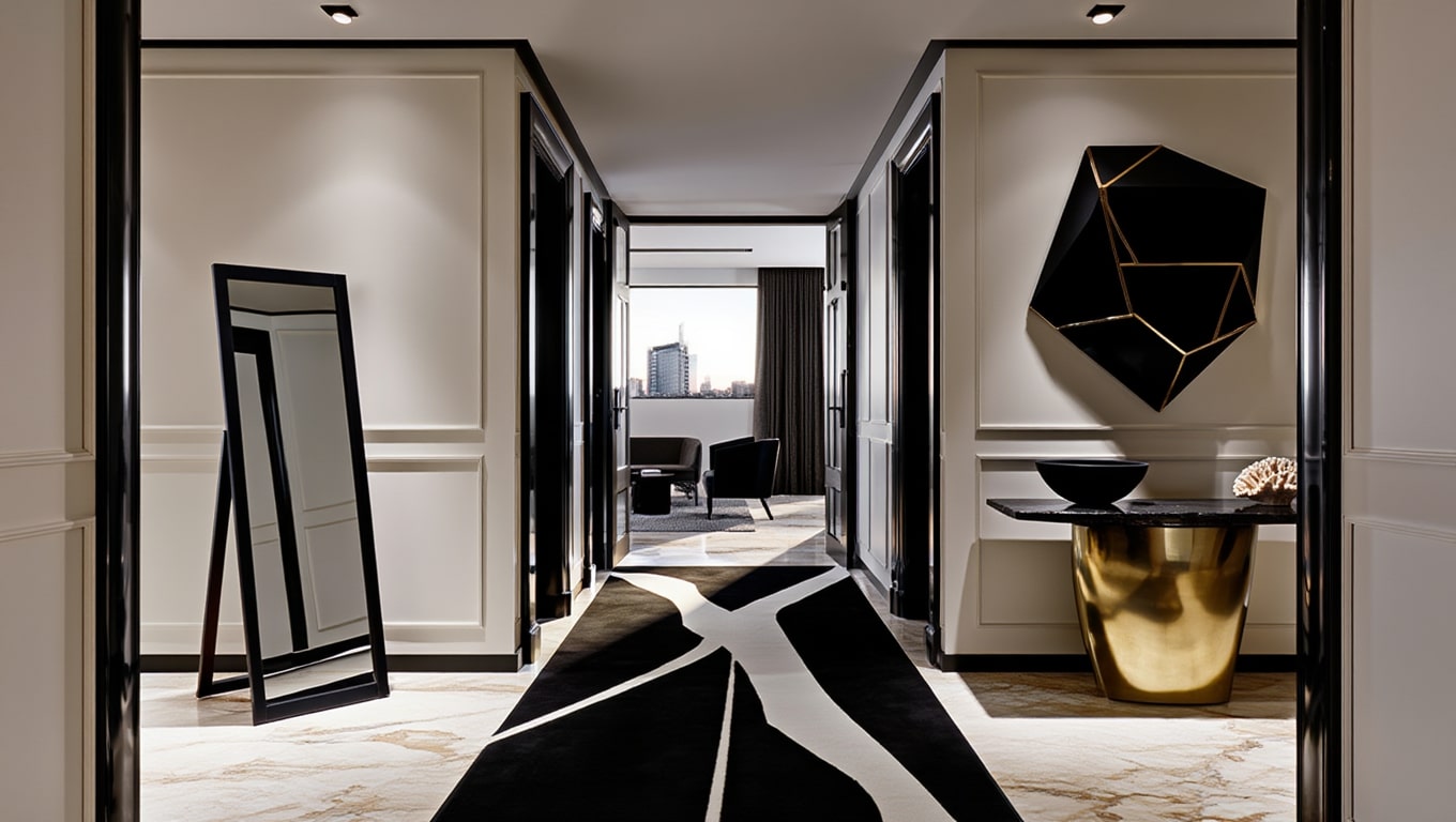 Associations matière — Mariez-le à un banc ou un valet en bois sombre, une patère métal et quelques objets en céramique mate ; limitez les fibres très rustiques pour rester dans un registre urbain graphique.