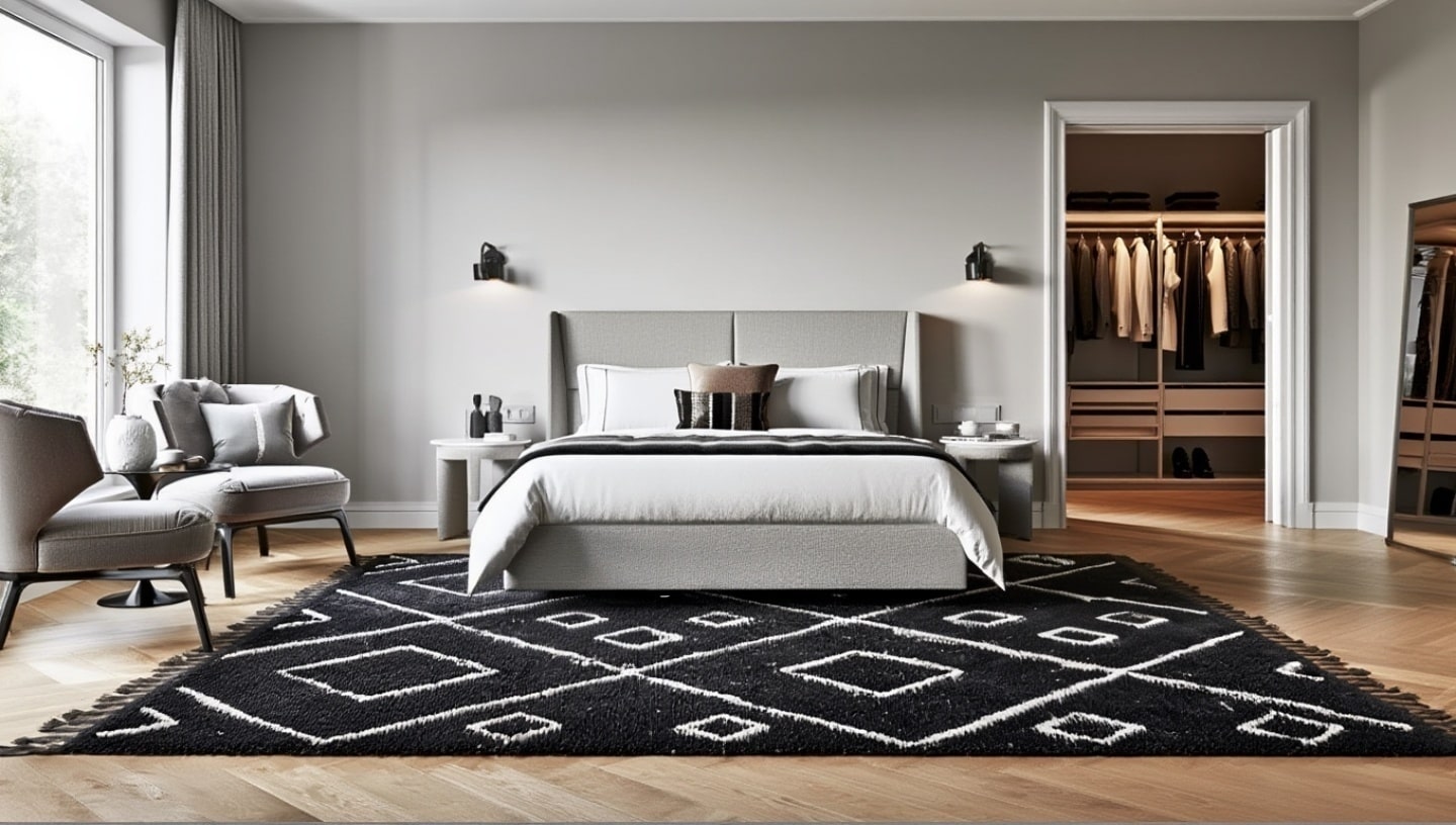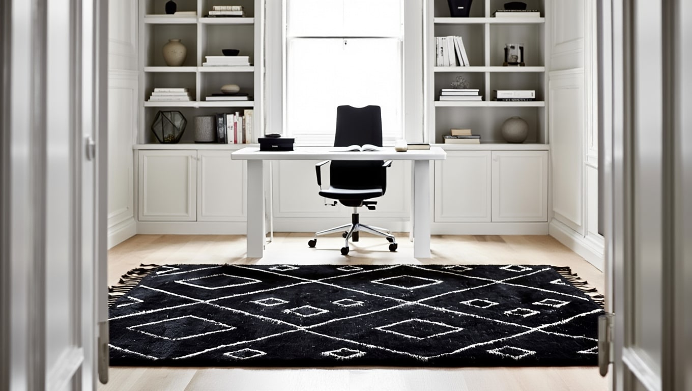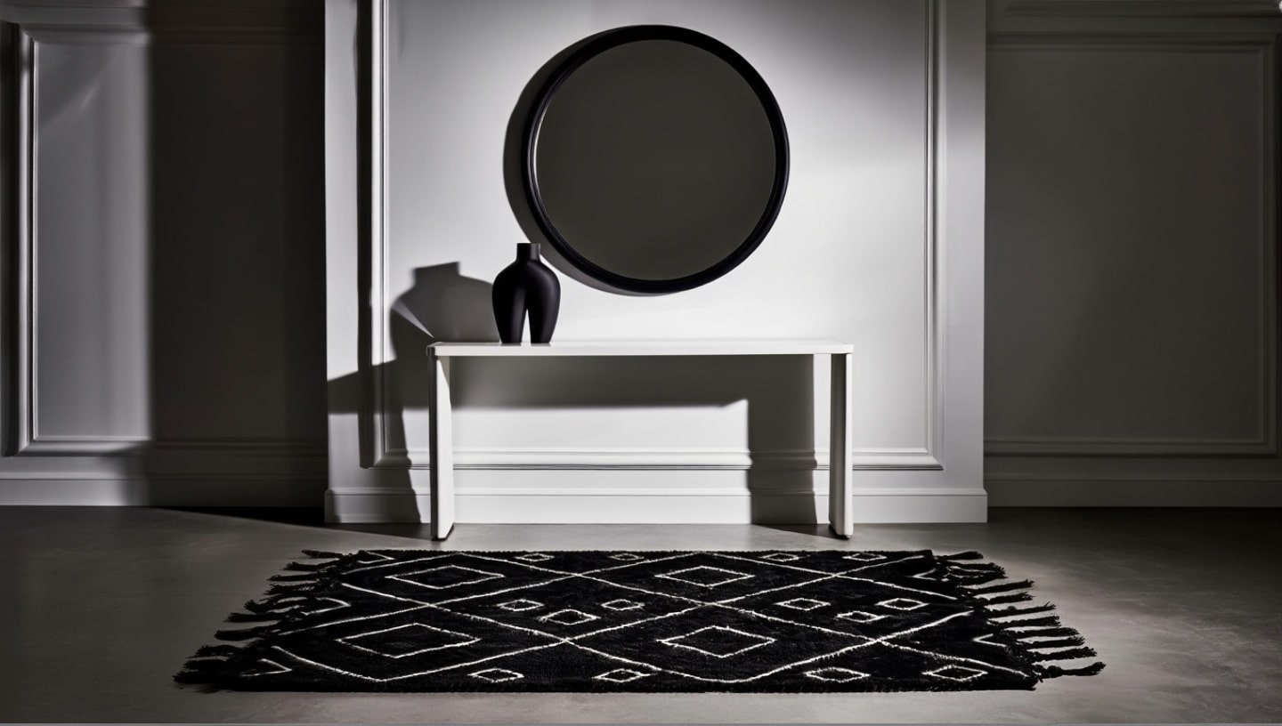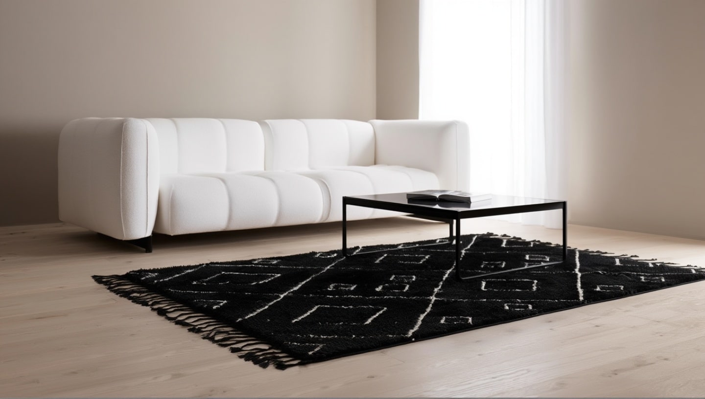 Tapis graphique noir à losanges blancs. Contraste fort, texture dense, allure urbaine affirmée.