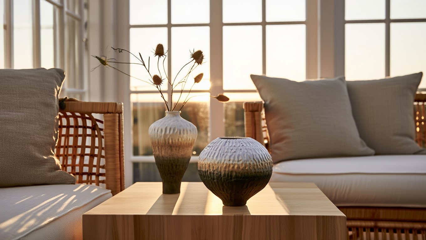 Duo de vases en céramique au dégradé texturé, idéal pour structurer une console d’ambiance Scandinavian Warm, équilibrer un buffet et mettre en valeur vos compositions.