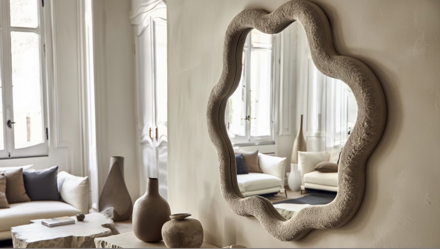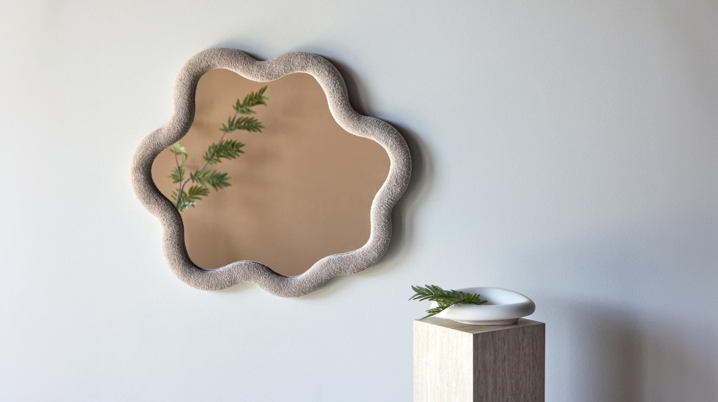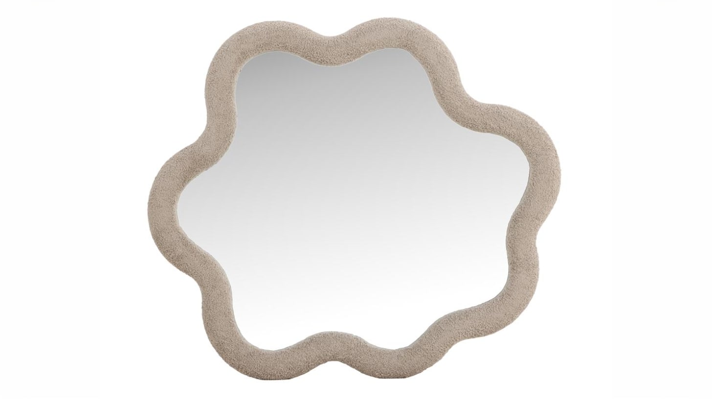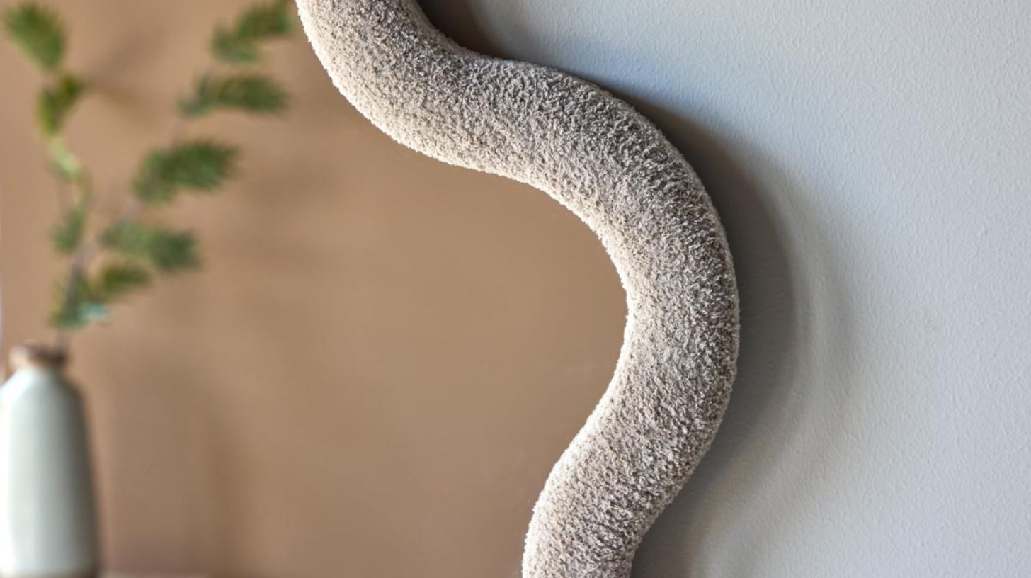 Miroir mural aux courbes organiques, encadré d’un textile bouclé doux, qui adoucit le mur, capte la lumière et ancre une ambiance Organic Modern.