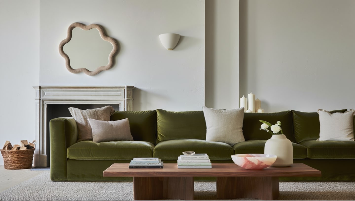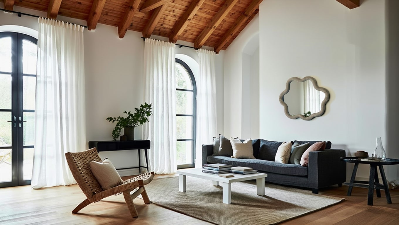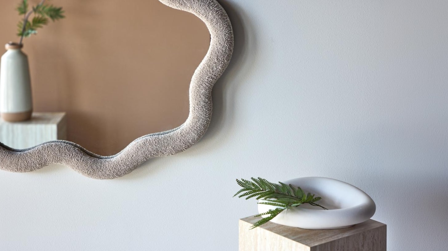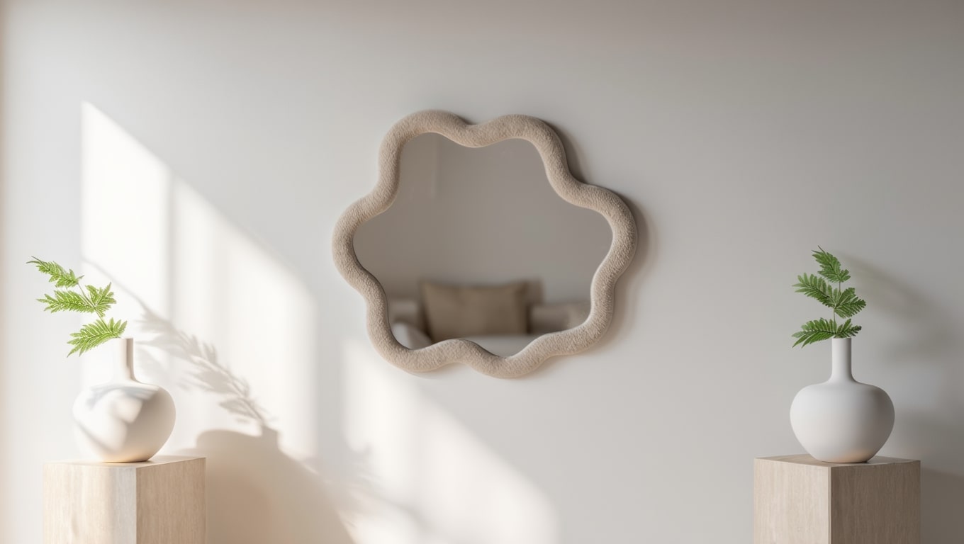 Miroir mural aux courbes organiques, encadré d’un textile bouclé doux, qui adoucit le mur, capte la lumière et ancre une ambiance Organic Modern.