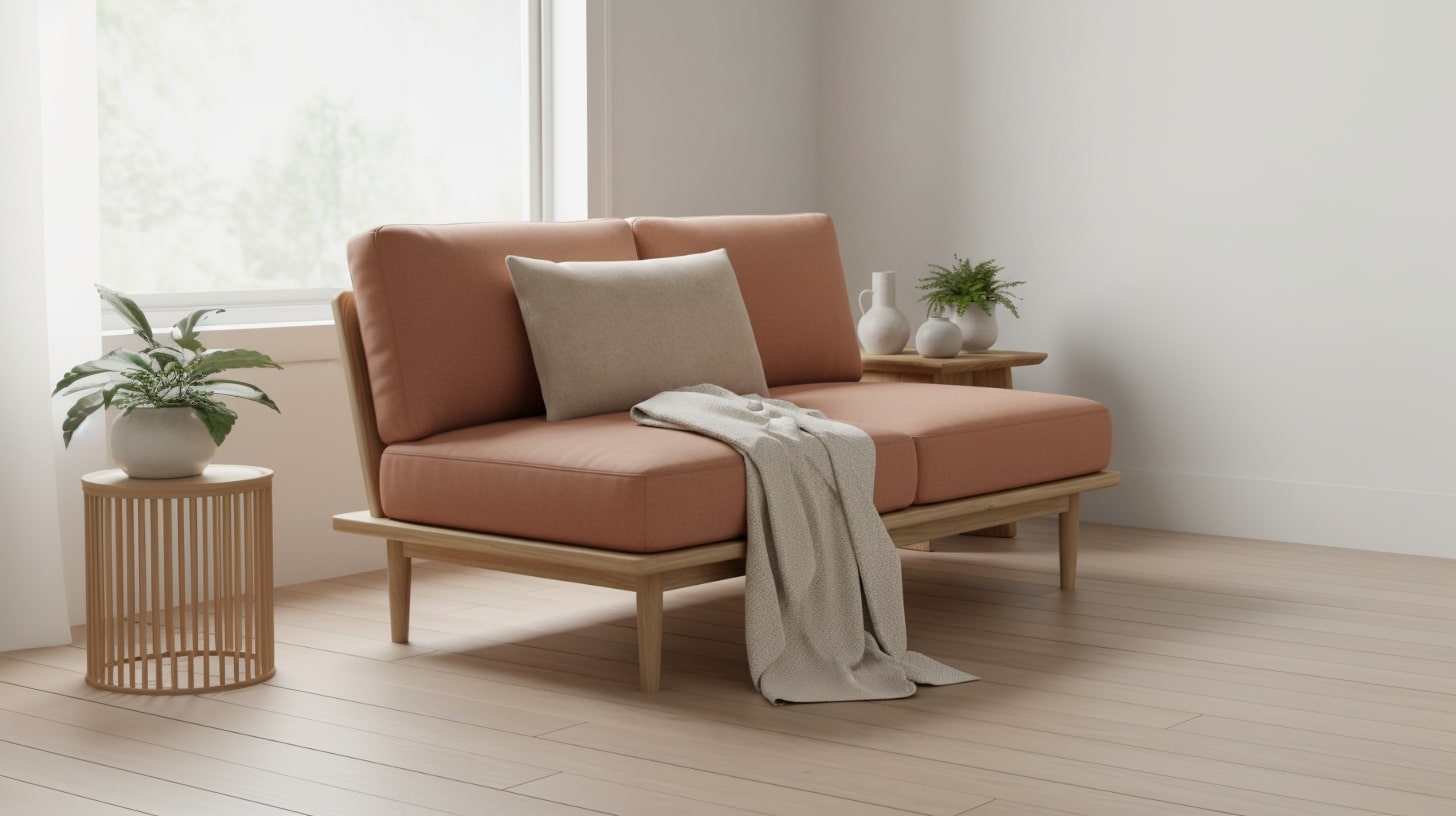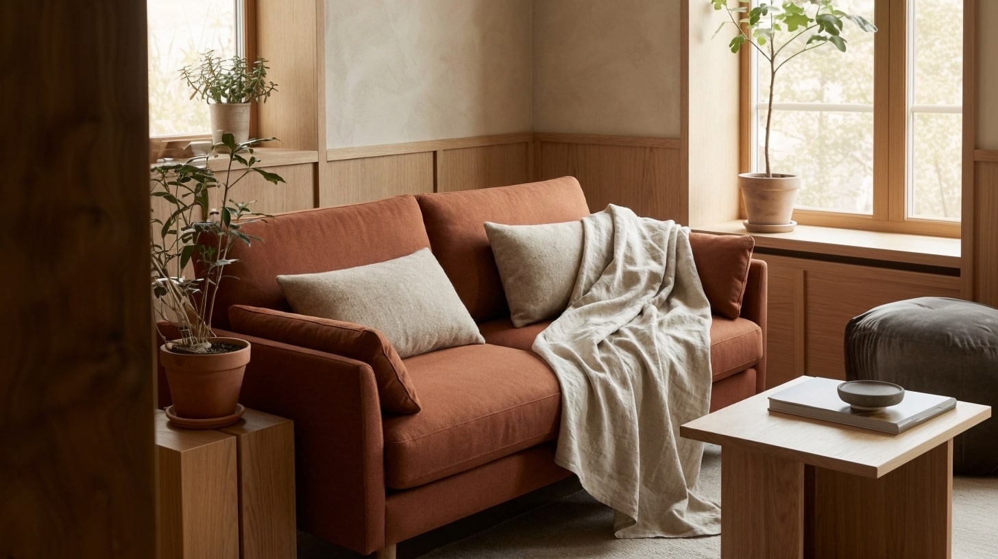 Associations matière — Associez le beige nuageux de Minayra à des bois clairs légèrement veinés, des plaids en maille généreuse et quelques céramiques mates pour renforcer la chaleur douce du salon. Complétez avec des touches de métal brossé, comme un petit plateau en laiton ou un pied de lampe, afin d’apporter une note lumineuse sans agressivité. Un tapis à poil court dans les mêmes tonalités et une couverture en laine posée négligemment sur l’accoudoir suffisent à créer une atmosphère conviviale, idéale pour les soirées d’hiver.