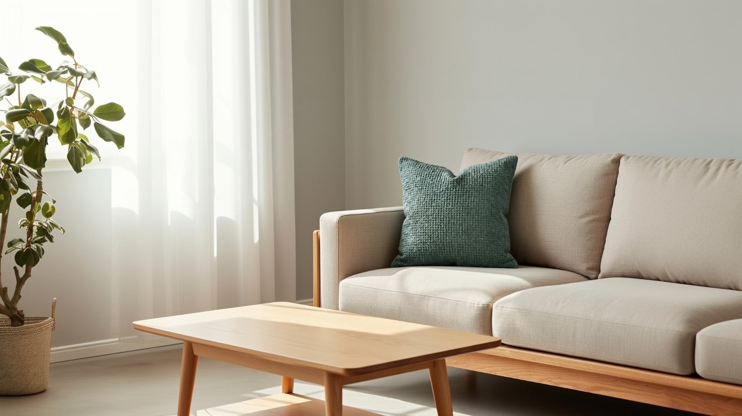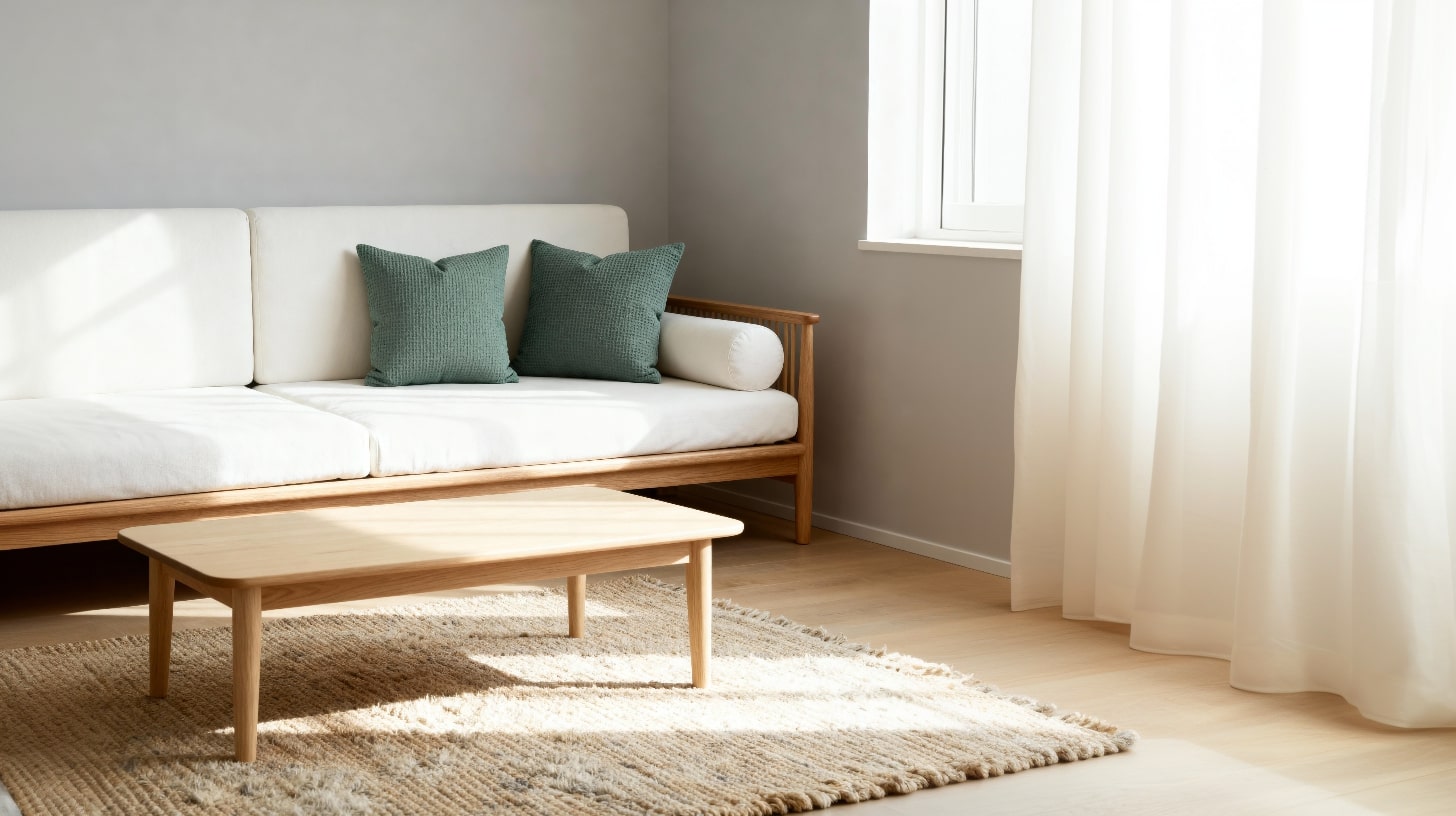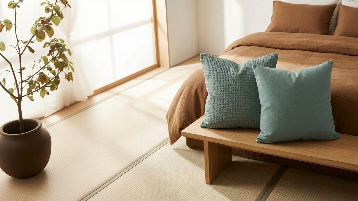 Associations matière — Le vert de gris s’accorde parfaitement avec le bois clair, le chêne, le frêne ou le bambou, ainsi qu’avec des céramiques mates aux tons sable. Ajoutez un plaid en coton gaufré ou en laine fine pour prolonger l’esprit naturel et texturé. Quelques éléments noirs mats ou en métal discret permettent de structurer l’ensemble sans rompre la douceur Japandi.