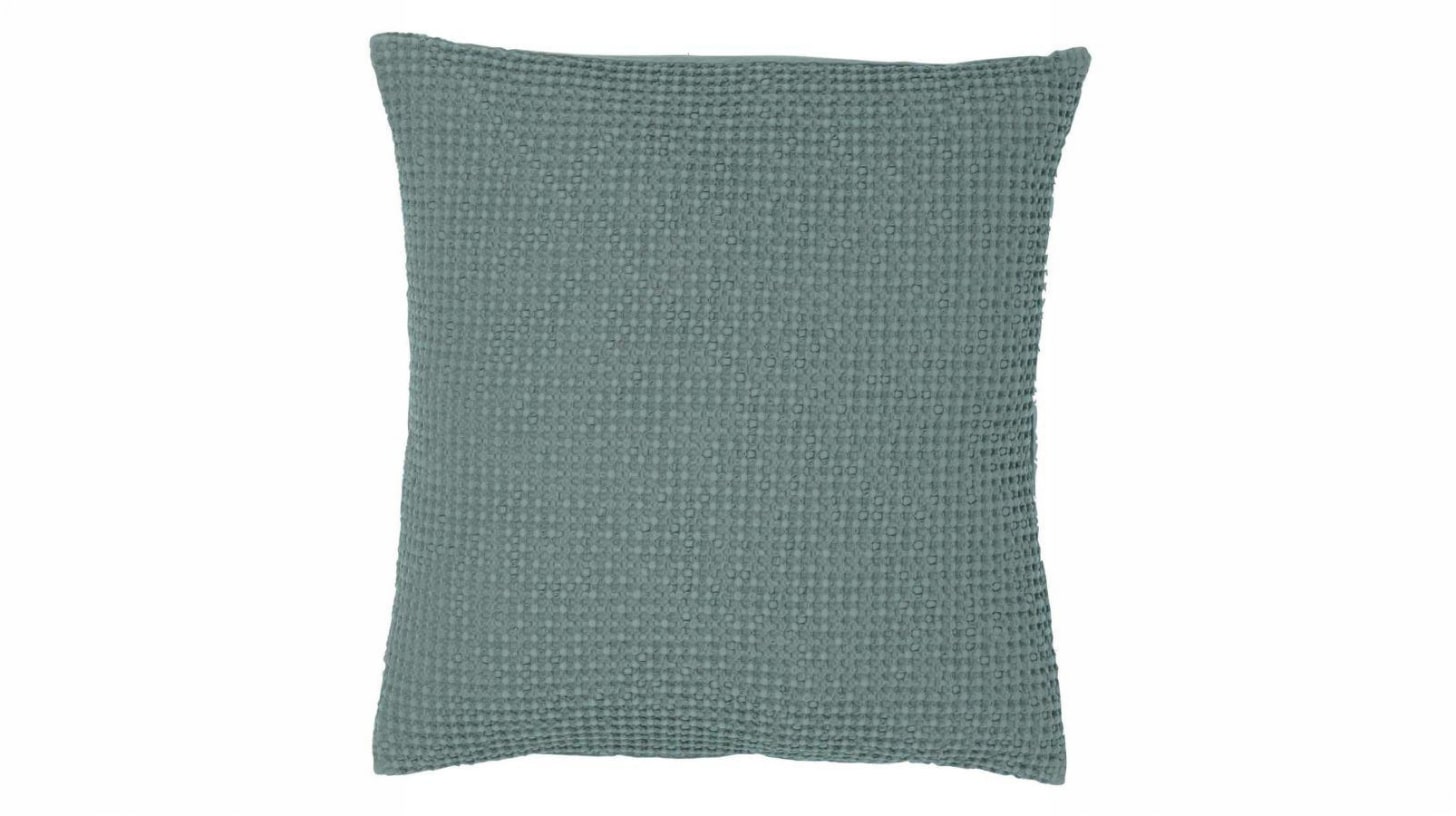 Coussin carré 45×45 en coton recyclé vert de gris, recto gaufré et verso lisse, fabriqué au Portugal, pour une touche zen et durable dans le salon.