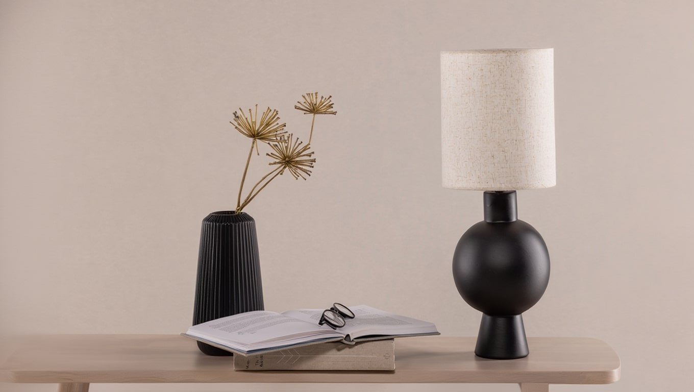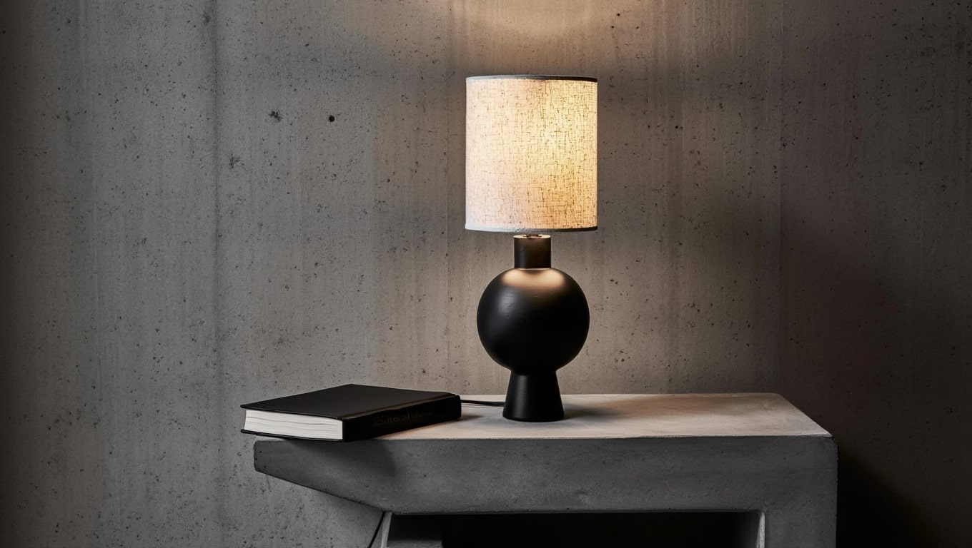 Lampe de table béton au dessin graphique. Rami diffuse une lueur d’appoint douce sous abat-jour cylindrique, idéale pour console, chevet ou bout de canapé.