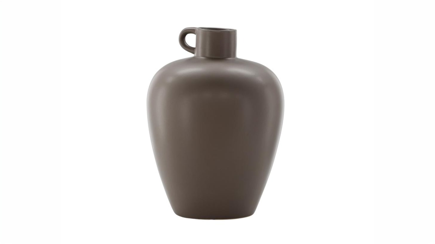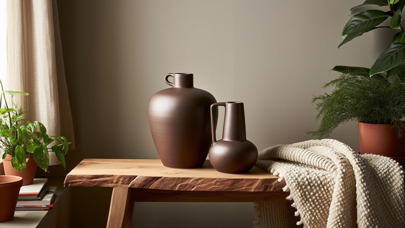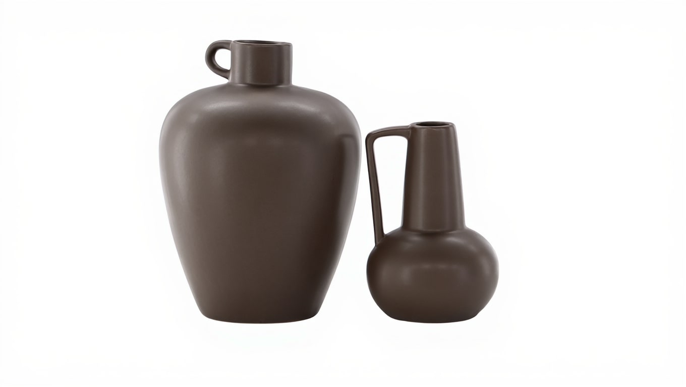 Duo de vases en stoneware brun mat, aux lignes généreuses, pour composer une scène Organic Modern sur une table, une console ou un buffet.