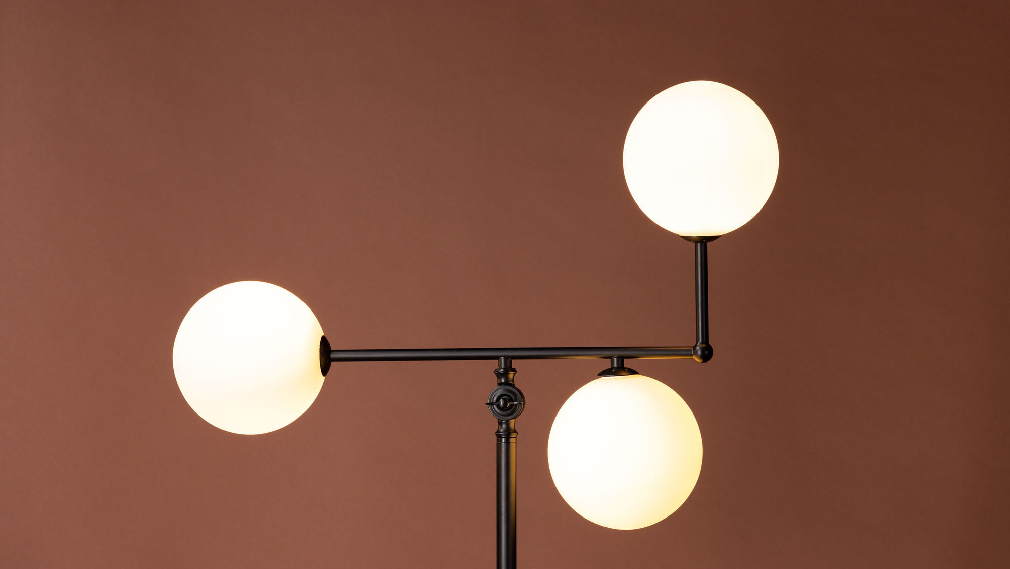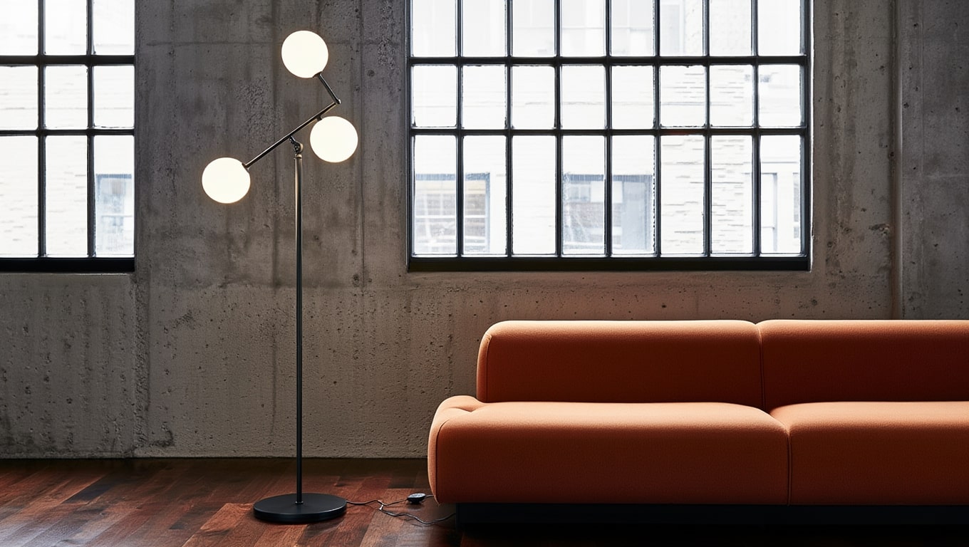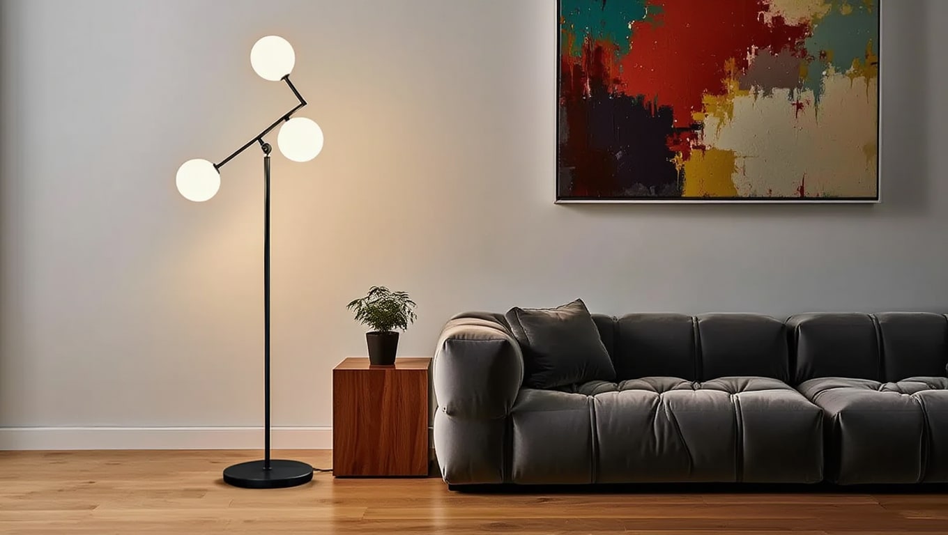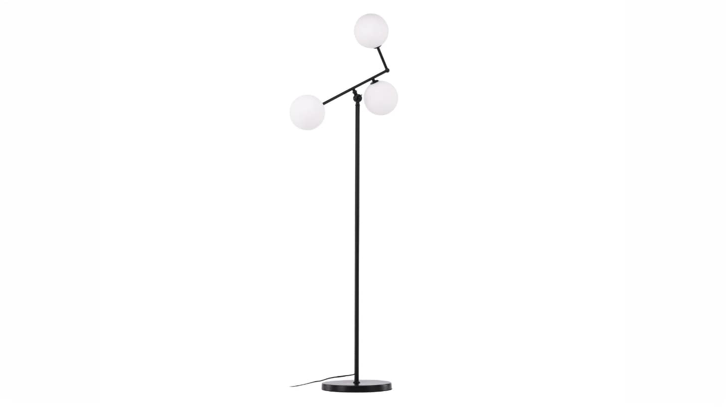 Trois globes en verre sur bras décalés. Le bras supérieur s’incline pour ajuster le rythme. Lampadaire graphique pour salon, coin lecture ou entrée.