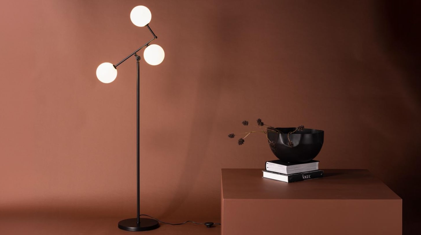 Rexo équilibre lignes tendues et courbes lumineuses. Le lampadaire déploie trois sources en hauteur pour rythmer le mur sans éblouir. Le bras supérieur est orientable pour affiner l’ouverture et cadrer la scène. Les globes diffusent une lueur douce qui apaise l’ambiance. À 160 cm, la présence reste légère près d’un canapé ou d’une console. Une constellation lisible qui structure l’espace sans l’alourdir.