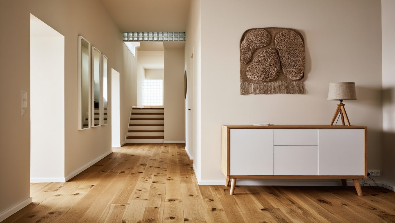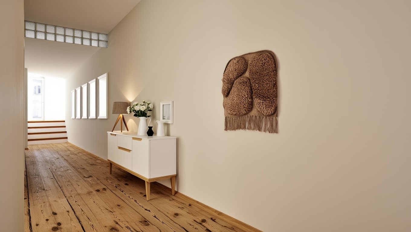 Placement — Suspendez Sigrid à hauteur de regard, légèrement décalé d’un angle ou centré au-dessus d’un meuble bas pour que le relief reste lisible sans écraser le mur.