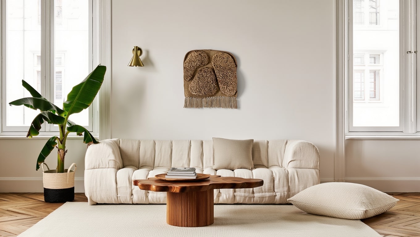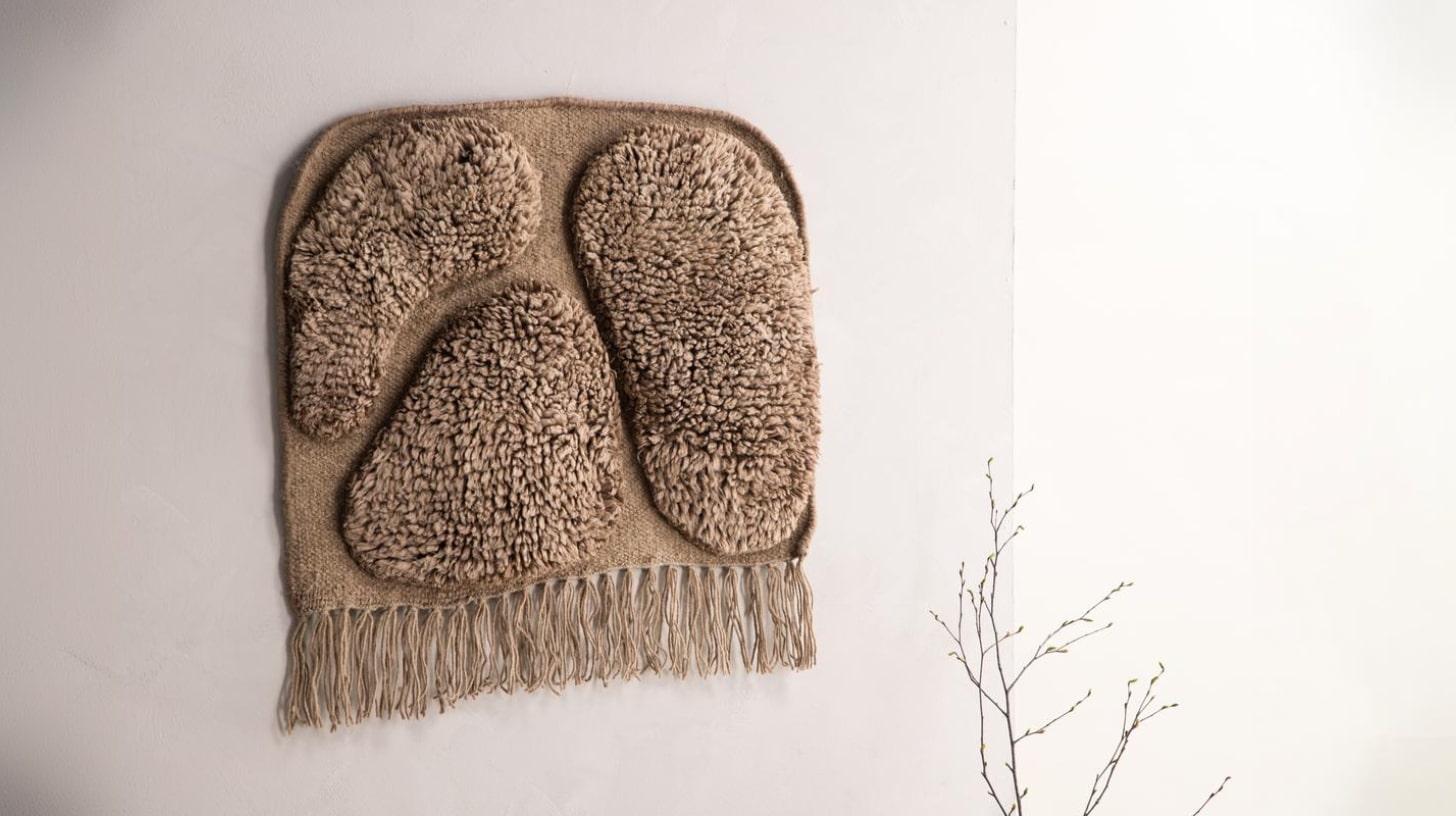 Tapis mural en laine à relief, inspiré des galets, qui réchauffe le mur, apporte du volume et installe une touche scandinave douce dans le salon ou la chambre.