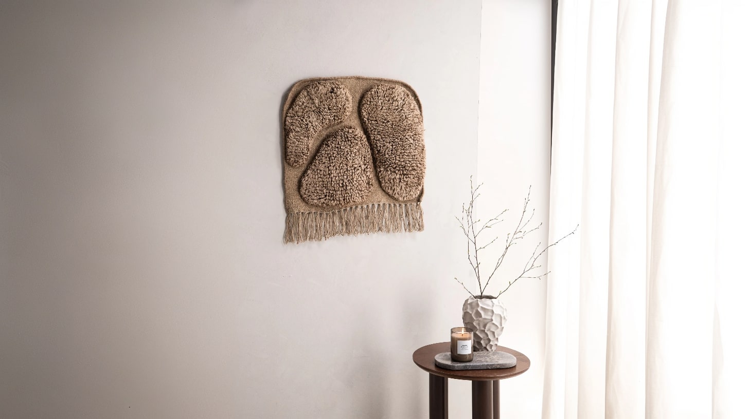 Sigrid est un tapis mural qui joue avec le relief pour donner du corps au mur. Les formes organiques évoquent des galets posés les uns contre les autres et adoucissent la verticalité. En laine épaisse, la surface capte la lumière et crée une ombre douce dans le creux des volumes. Accroché seul, il devient un accent de déco murale qui réchauffe immédiatement le regard. Il trouve facilement sa place au-dessus d’un canapé, d’une console ou dans un coin lecture pour structurer un pan de mur sans l’alourdir.