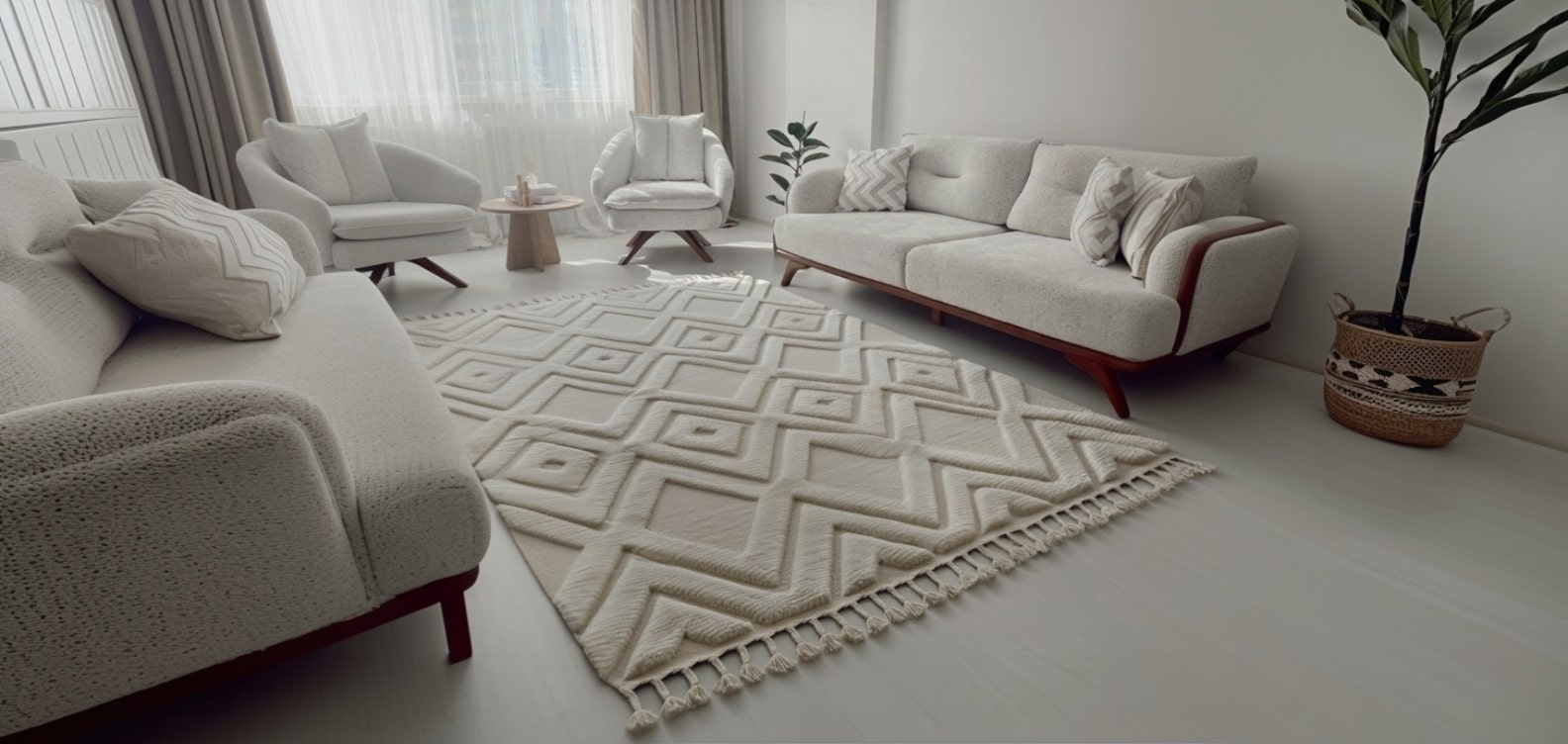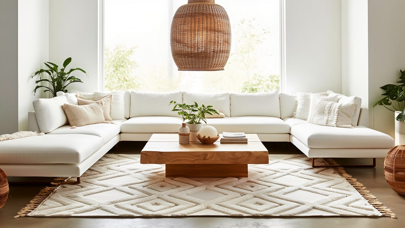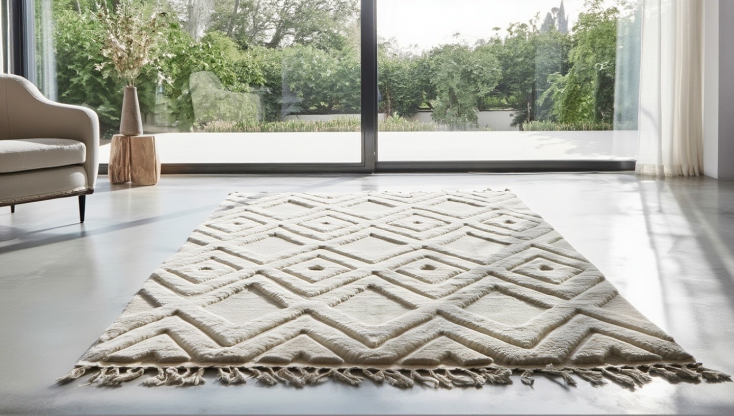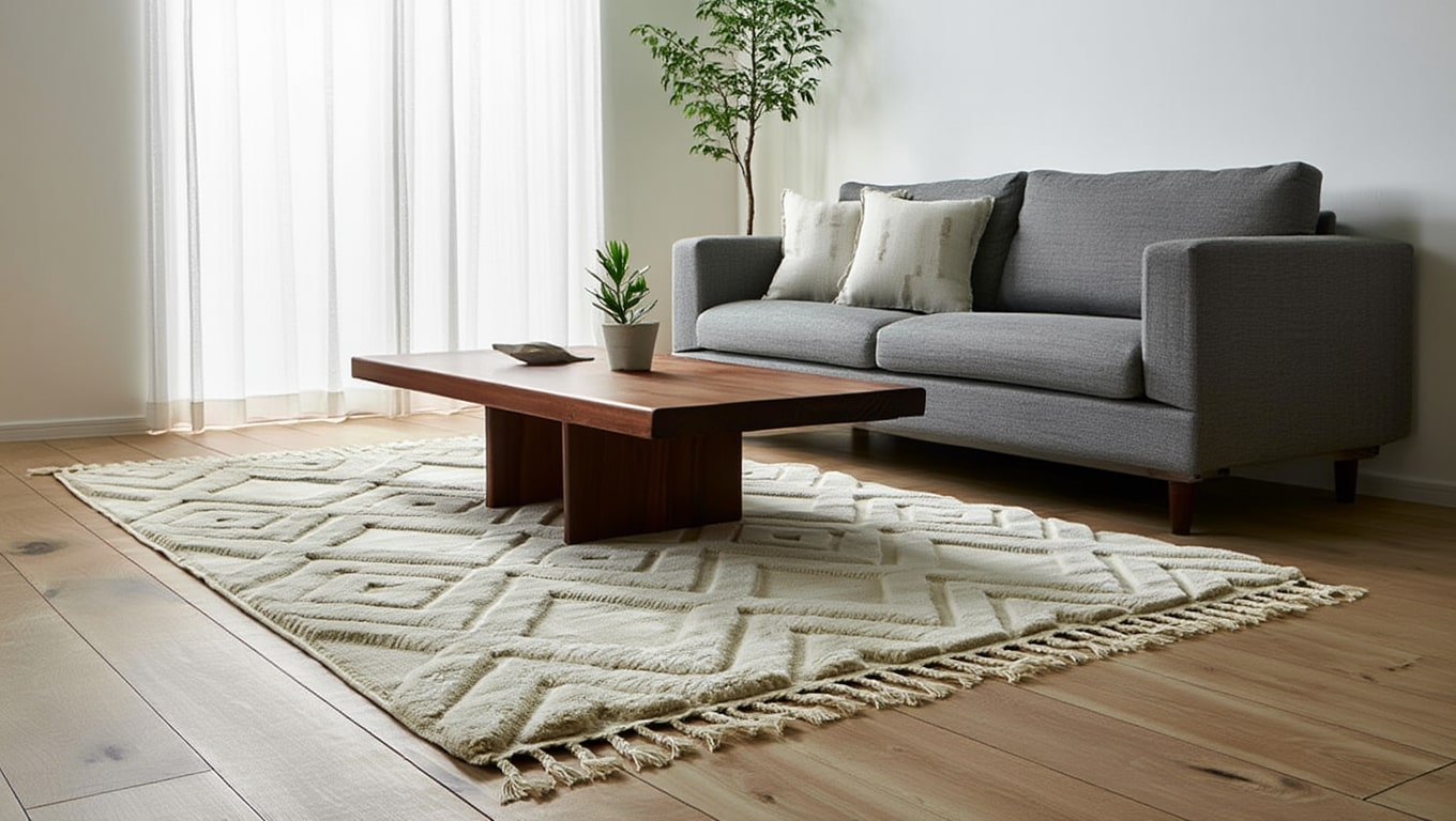 Placement — Placez-le sous un canapé clair ou au centre du salon pour équilibrer volumes et lumière.