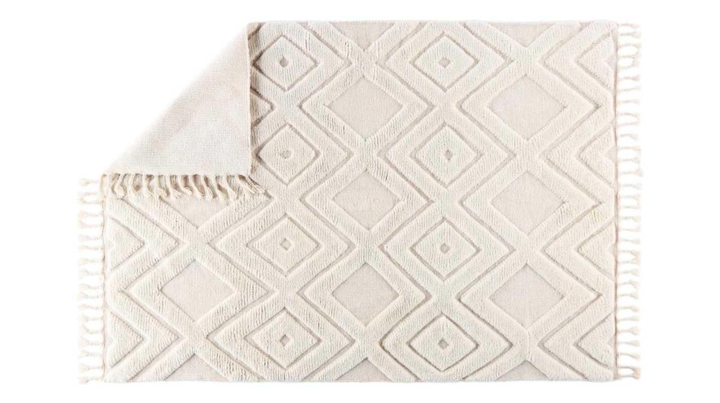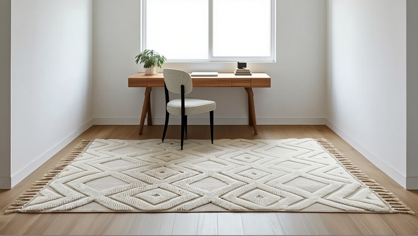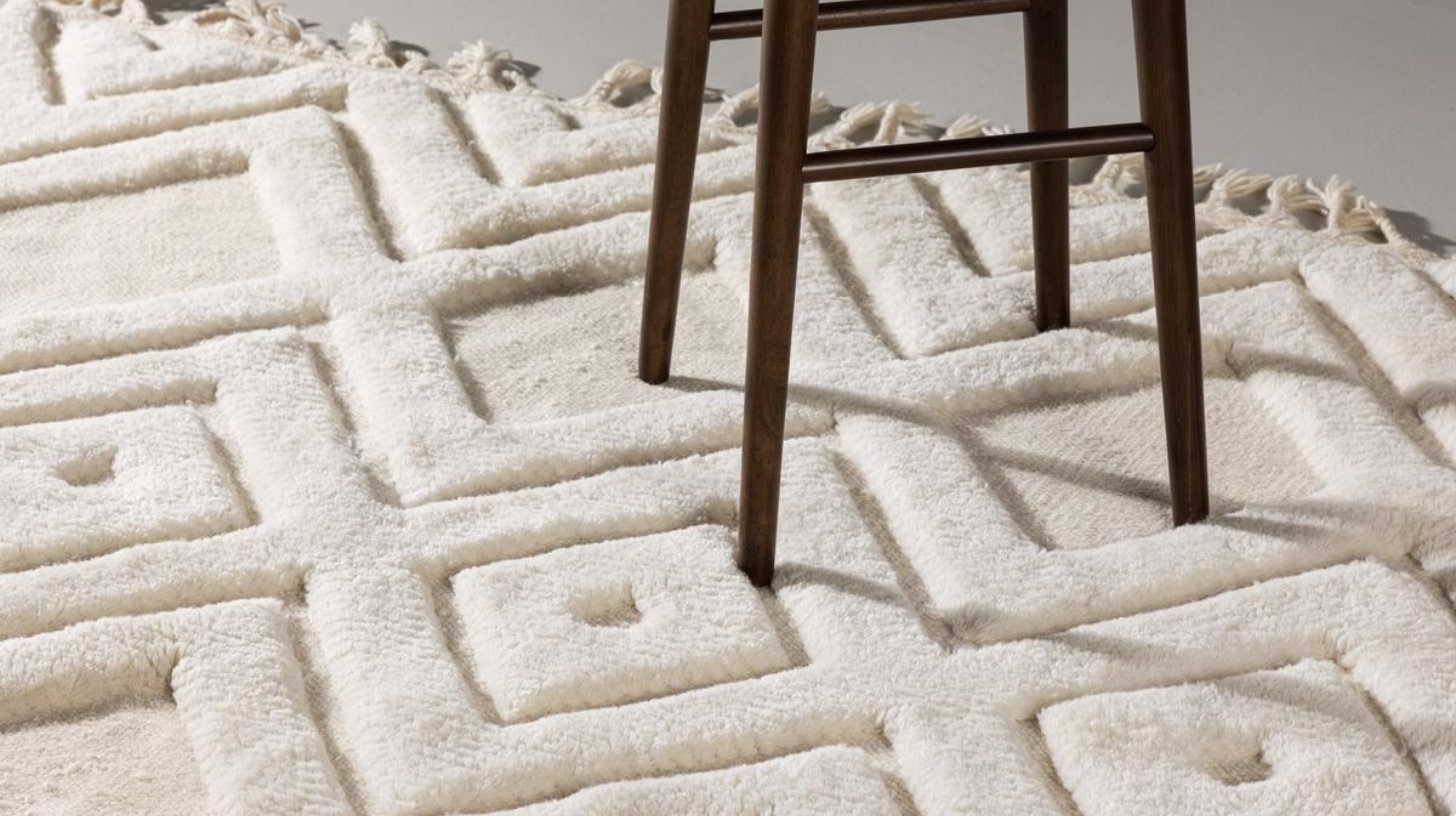 Tapis rectangulaire en laine blanche au relief géométrique doux et sculpté. Élégance naturelle et chaleur nordique.