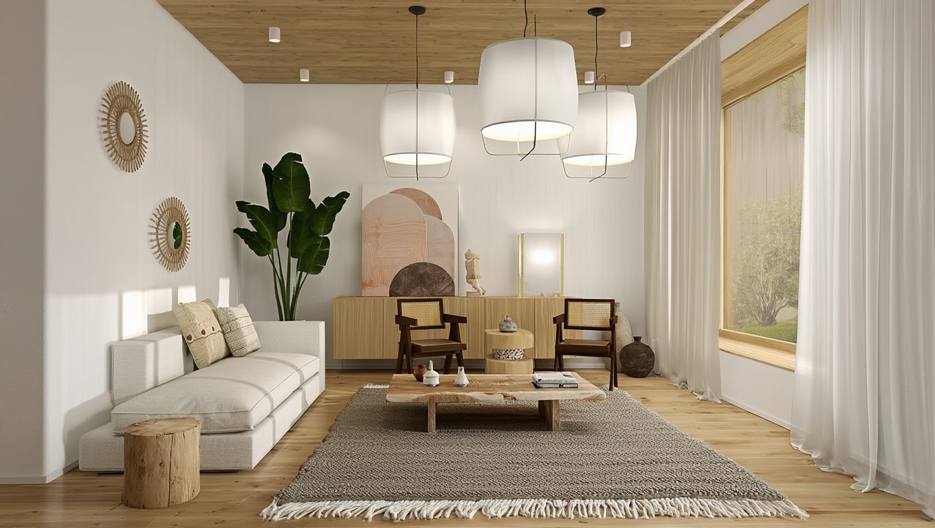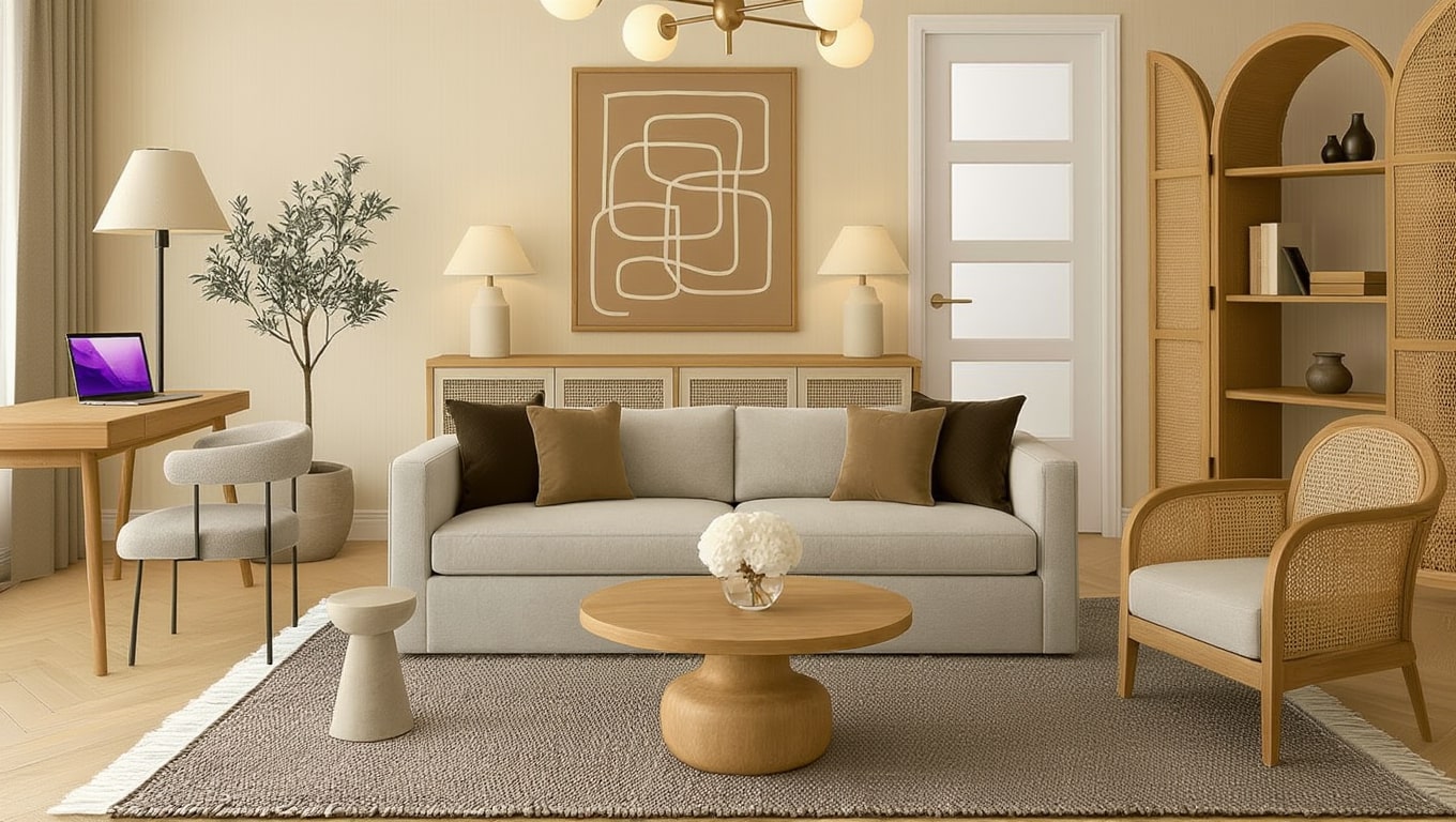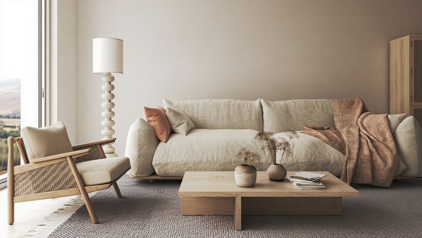 Associations matière — Chêne blond, lin naturel, céramique mate ; évitez métal poli et verre brillant pour garder la douceur.
