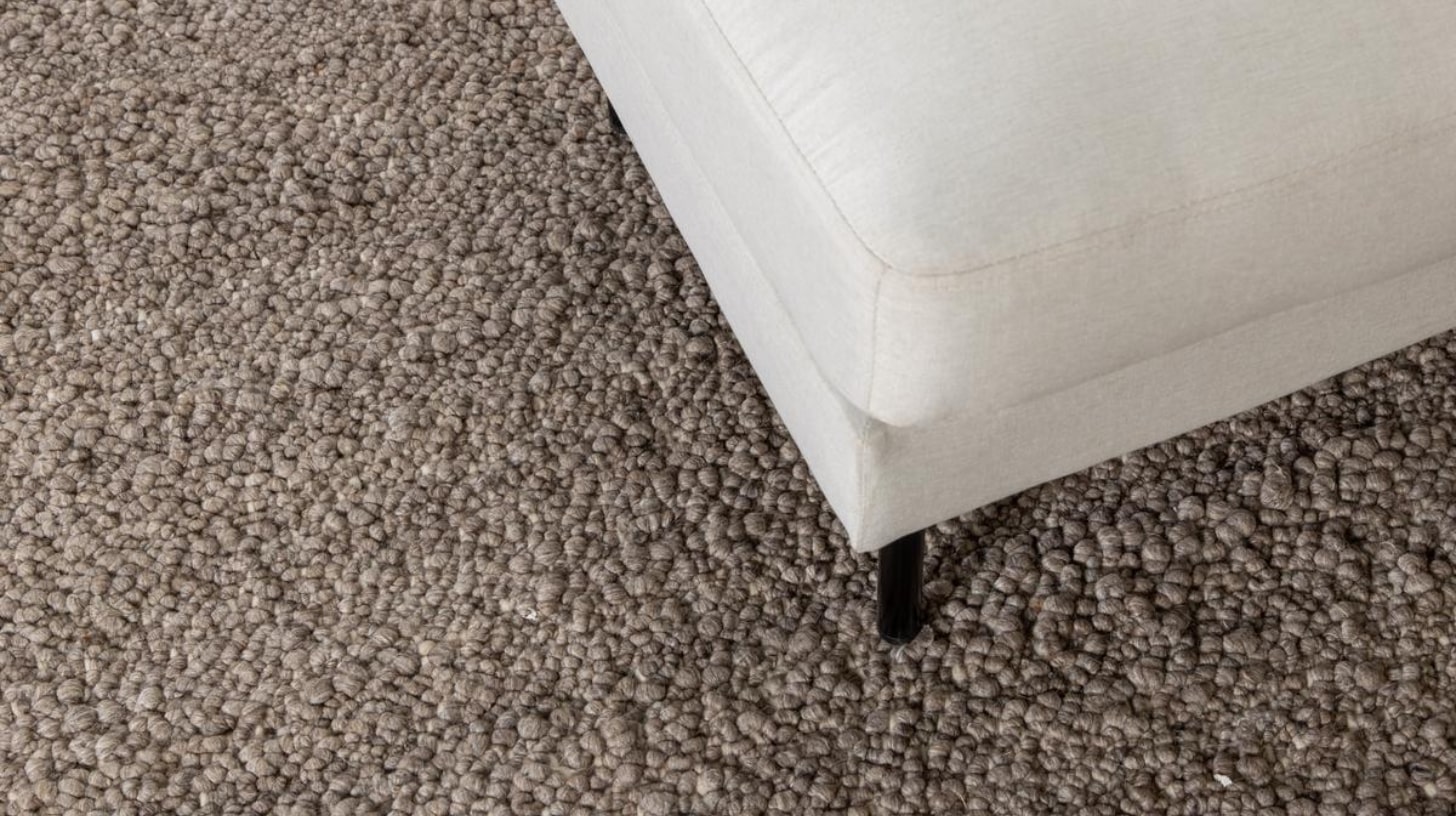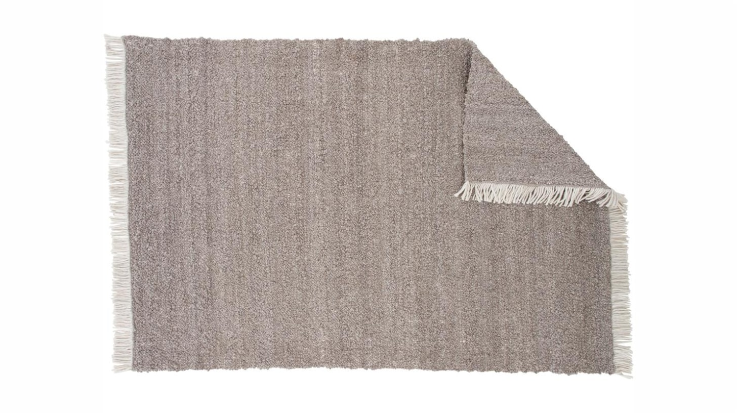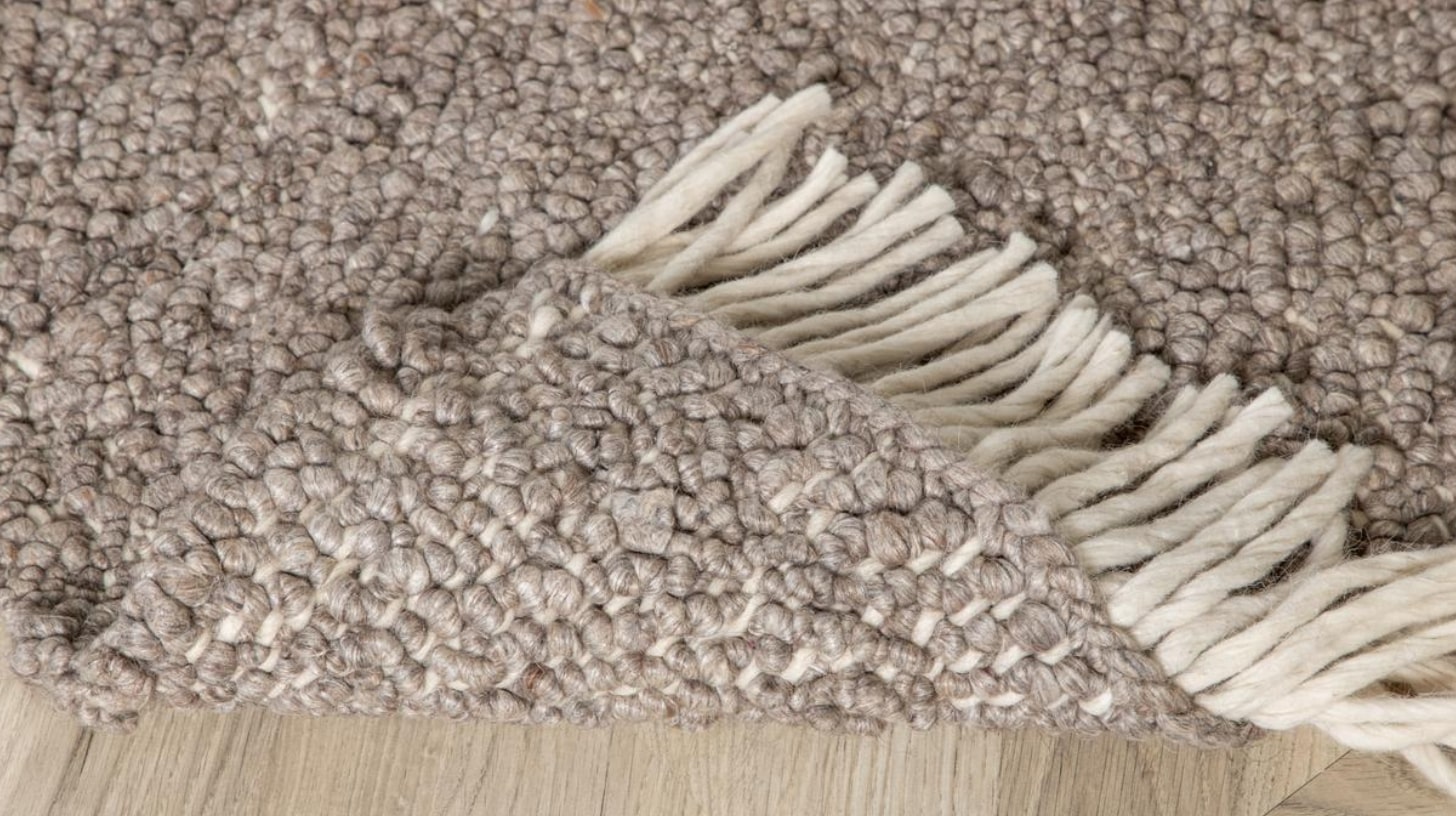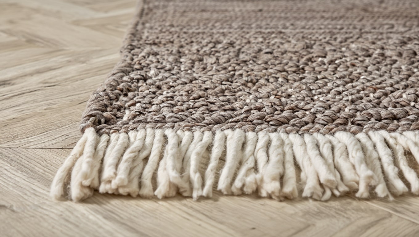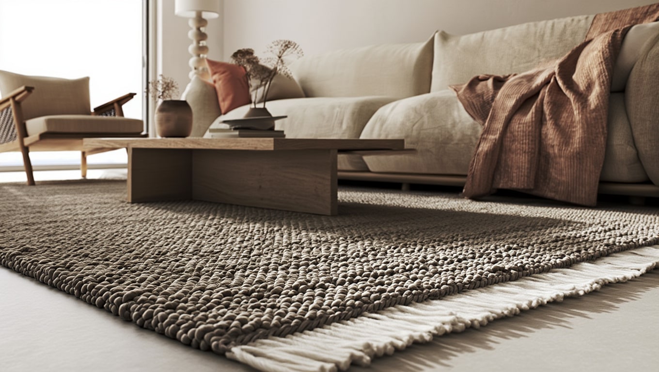 Tapis en laine épaisse brun, tissé main. Texture dense et chaleureuse pour un espace serein et équilibré.