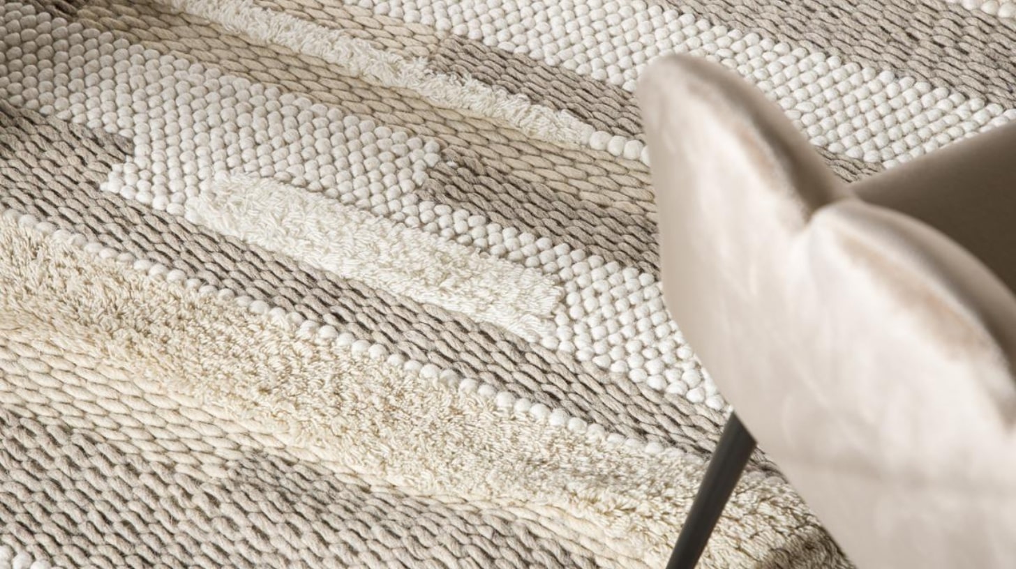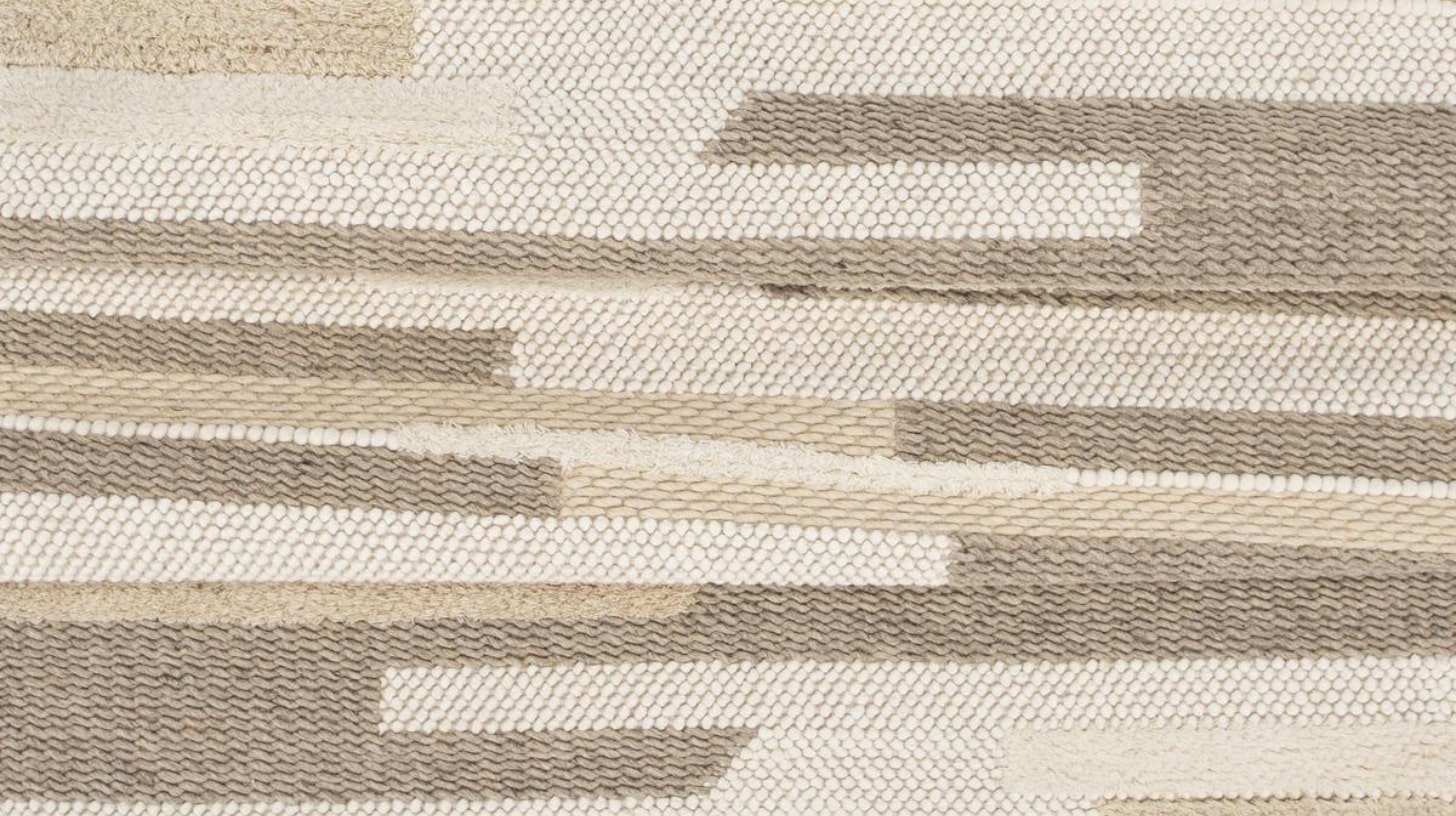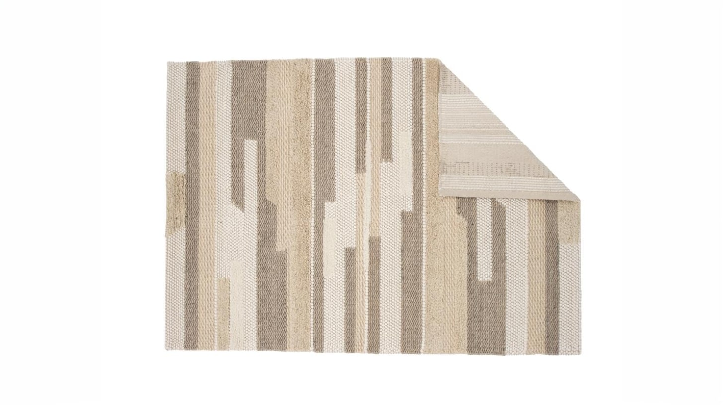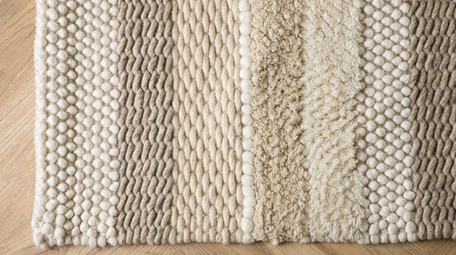 Tapis laine 230×160 tissé main, jeu de tons beiges et crème. Relief subtil et chaleur douce pour intérieur scandinave.