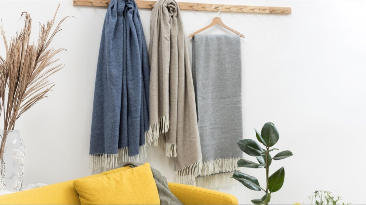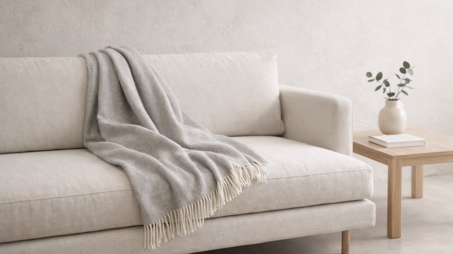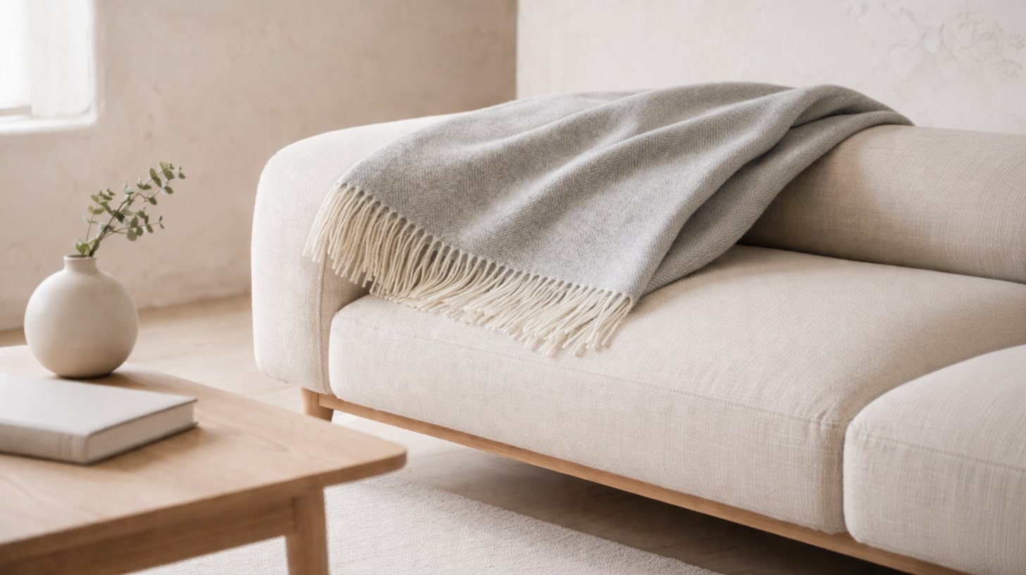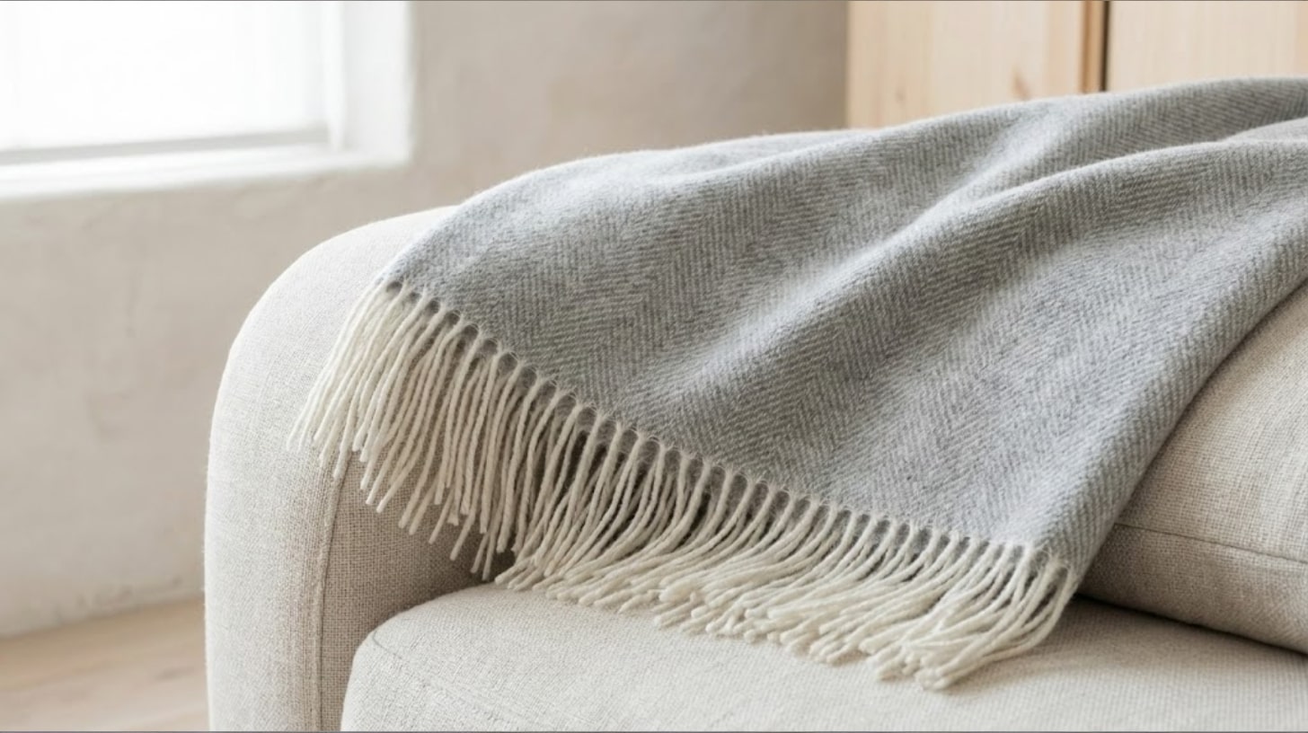 Plaid mérinos cachemire 130×190, tissage chevrons et franges torsadées : une pièce japandi douce, au quotidien, pour votre canapé ou bout de lit.