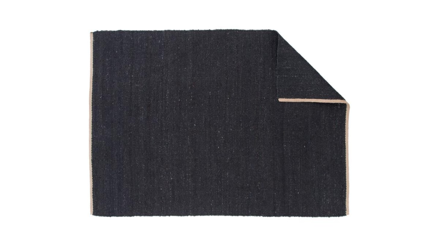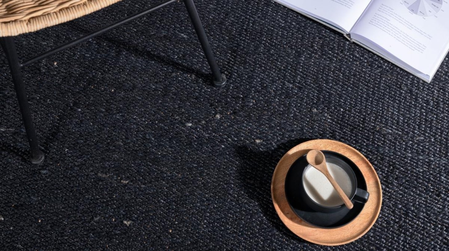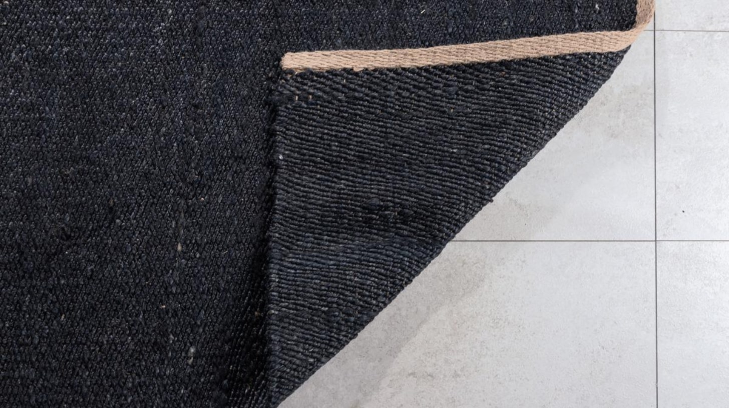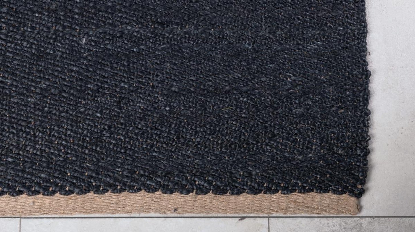 Tapis en jute noir tissé main, bordé de jute naturel. Relief brut et contraste zen pour un style épuré.