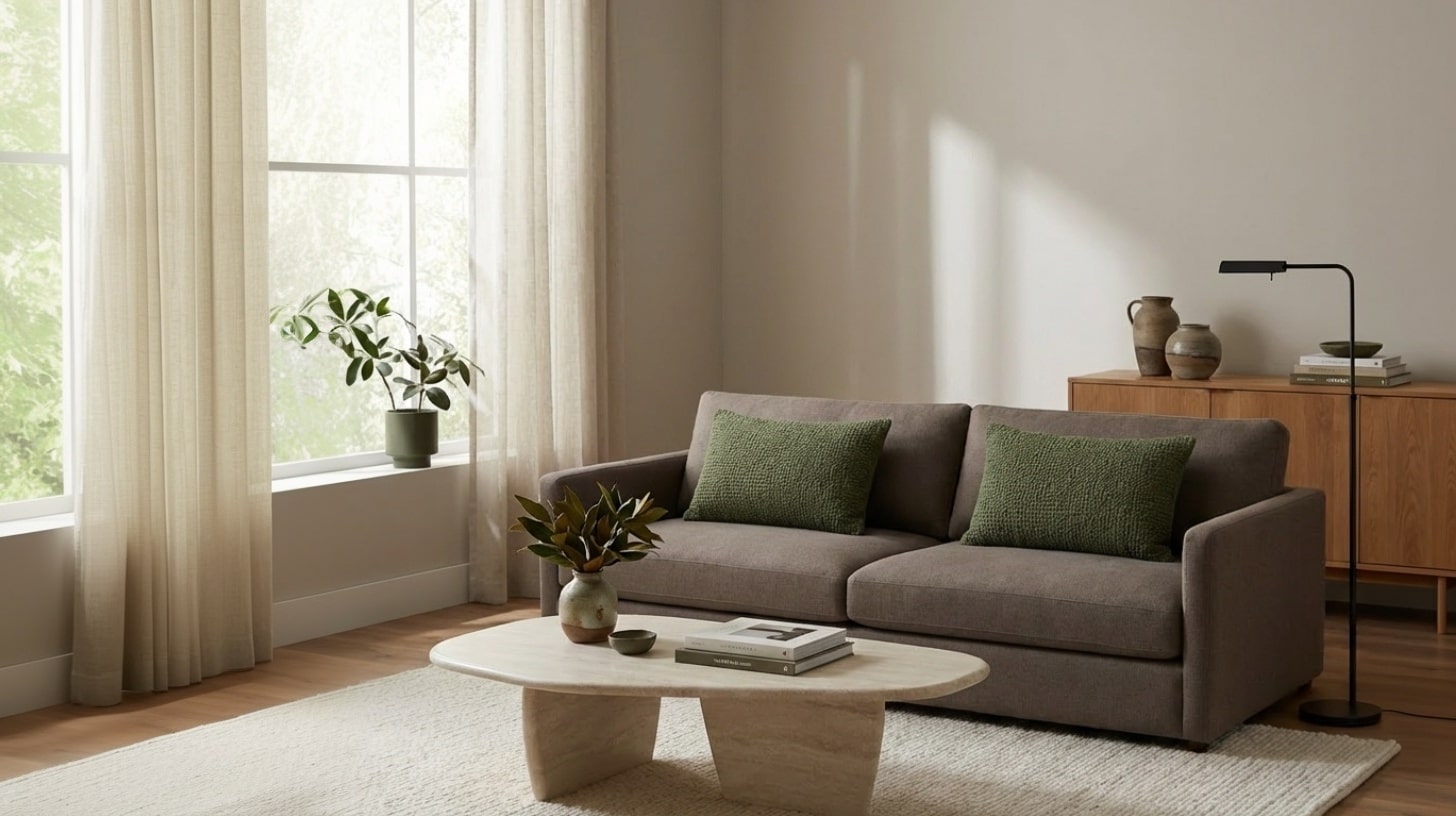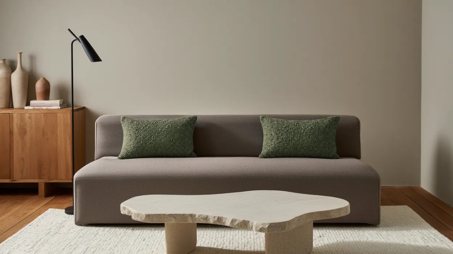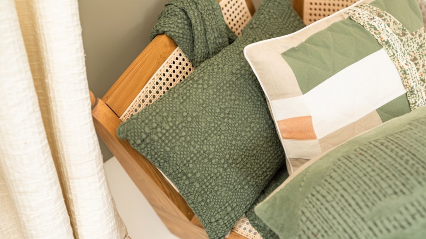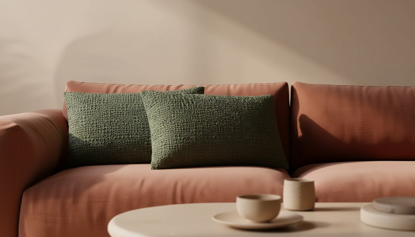 Éclairage — Positionnez Tavriel près d’une lampe de table ou d’une suspension à lumière chaude pour souligner le relief du tissage et les nuances du vert. Une source légèrement latérale fait apparaître de petites ombres dans le motif, ce qui renforce la perception de profondeur. En lumière naturelle, installez-le près d’une baie ou d’une fenêtre pour que le coussin relie visuellement l’extérieur végétal à l’intérieur du salon.