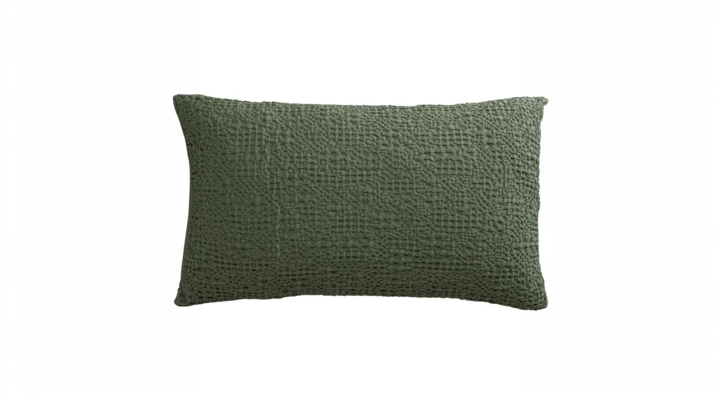 Coussin rectangulaire 40×65 en coton stonewashed vert mousse, recto texturé nid d’abeille et verso lisse, idéal pour structurer un canapé Organic Modern.