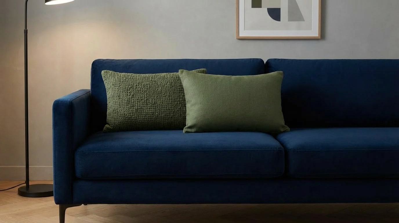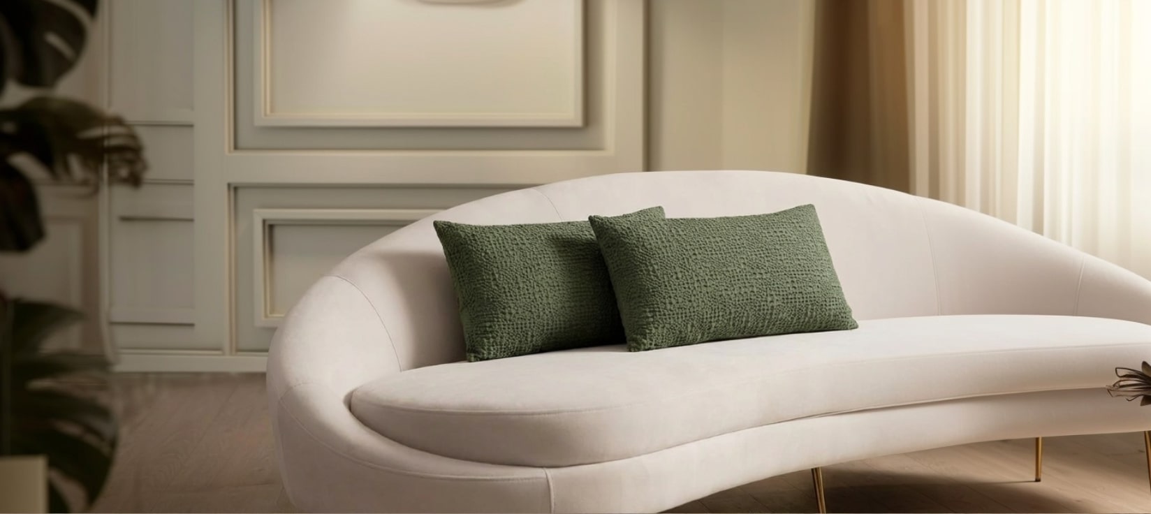 Placement — Placez Tavriel sur un canapé aux lignes droites pour casser la rigidité de l’assise et apporter un volume plus organique. En duo, alignez deux coussins 40×65 le long du dossier pour créer une bande graphique de vert mousse, puis complétez avec un coussin carré plus clair au centre. Sur un banc en bois ou une banquette d’entrée, utilisez-le comme pièce unique pour transformer une assise minimaliste en point de confort marqué.