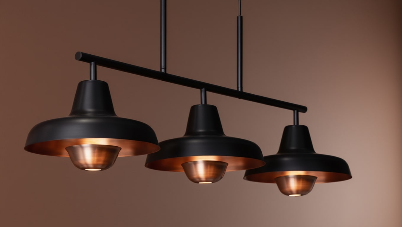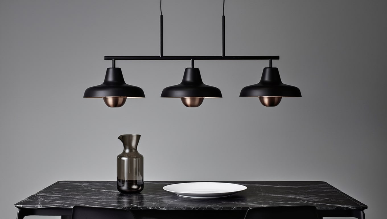 Suspension linéaire en métal à trois abat-jour. Ziv structure la table et offre une lumière confortable pour repas, îlot ou grand couloir.