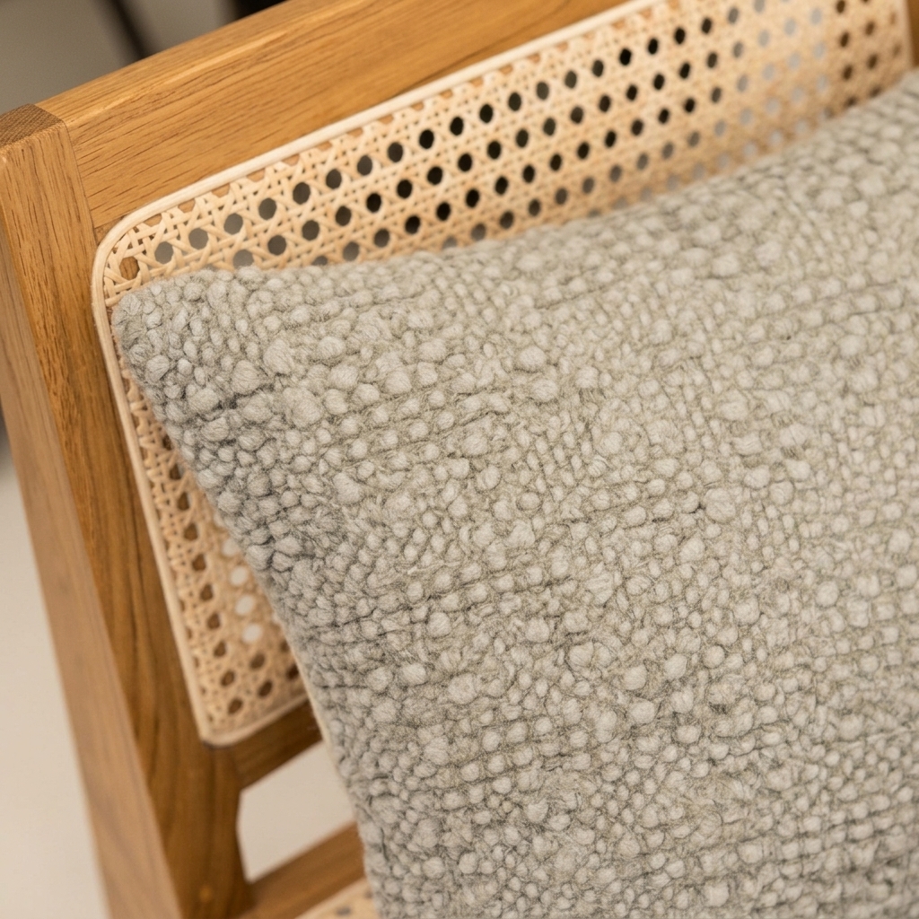 Associations matière – Lin lavé, laine bouclée, bois blond, grès clair. Évitez les textures trop lisses qui écraseraient le relief nid d’abeille.